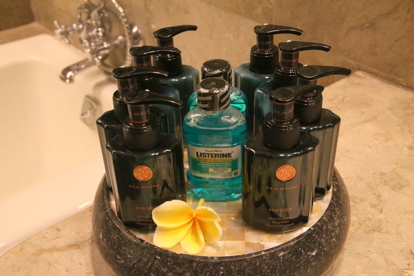 The generous amenity kit included 100 ml bottles of Harnn Mystique shampoo, conditioner, body lotion and shower gel. Listerine mouthwash, water bottles and sewing, shoe care and dental kits were also provided.