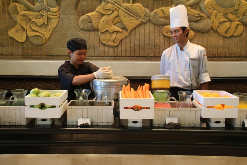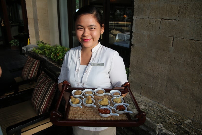 In Bali, it's normal for the full wait staff to handle the complete set of tables, unlike in the US where a table is normally assigned to one server. You may get asked for your order after you've already given it, but it's always done with a smile and the utmost politeness. You may actually have to make eye contact or wave a server down to place your order, but just roll with it — this is the Bali way.
