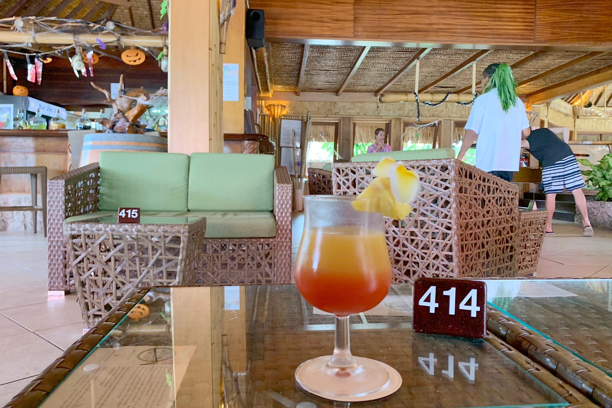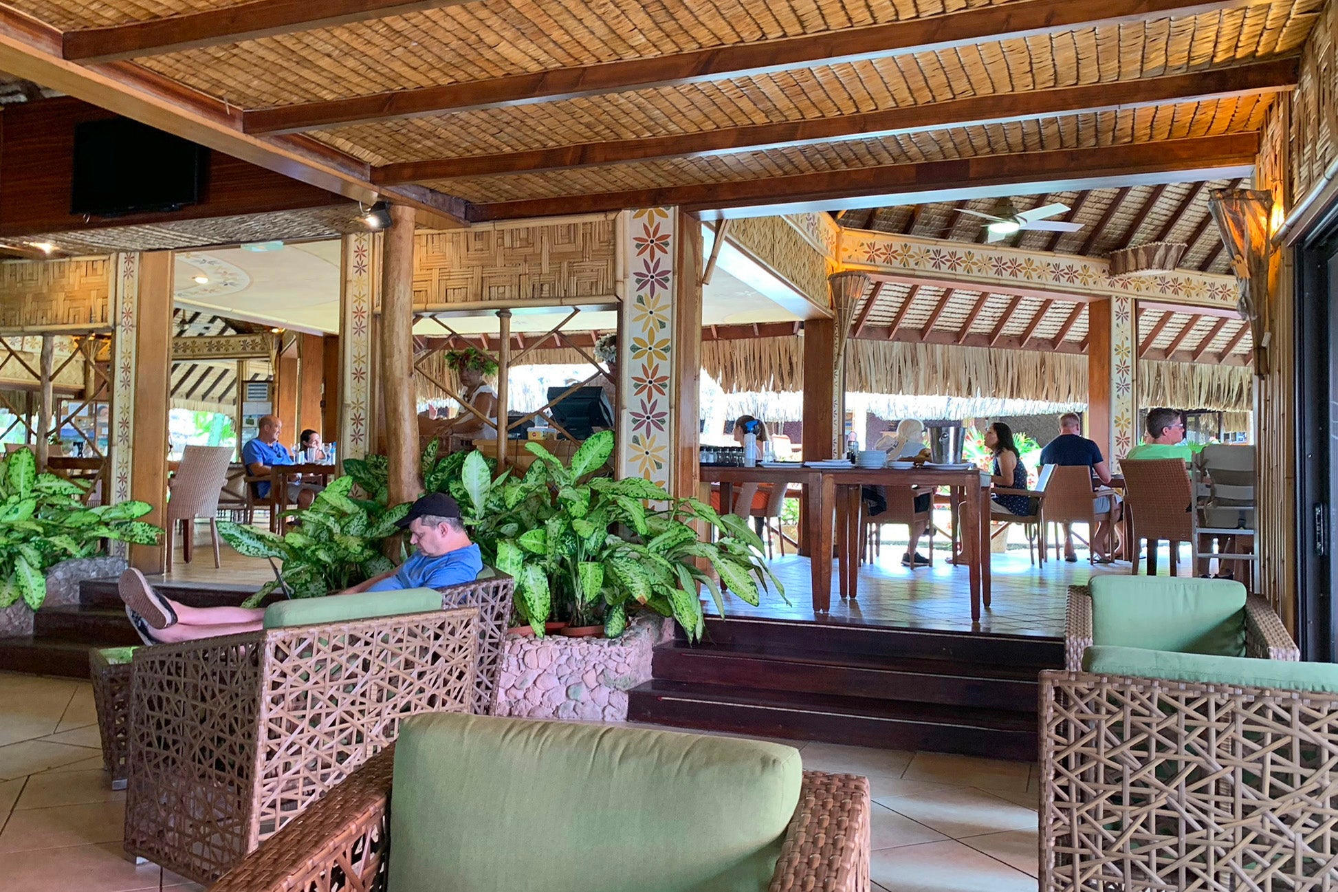 After making my own way from the dock, I came upon a large room filled with Western tourists. Since it was raining outside, some were lounging around, with others playing pool, checking out the bar or eating a leisurely lunch. It appeared to be one of the resort's only covered hangouts, and more closely resembled a common area at a Southeast Asian hostel than the main dining area of a popular Bora Bora resort.