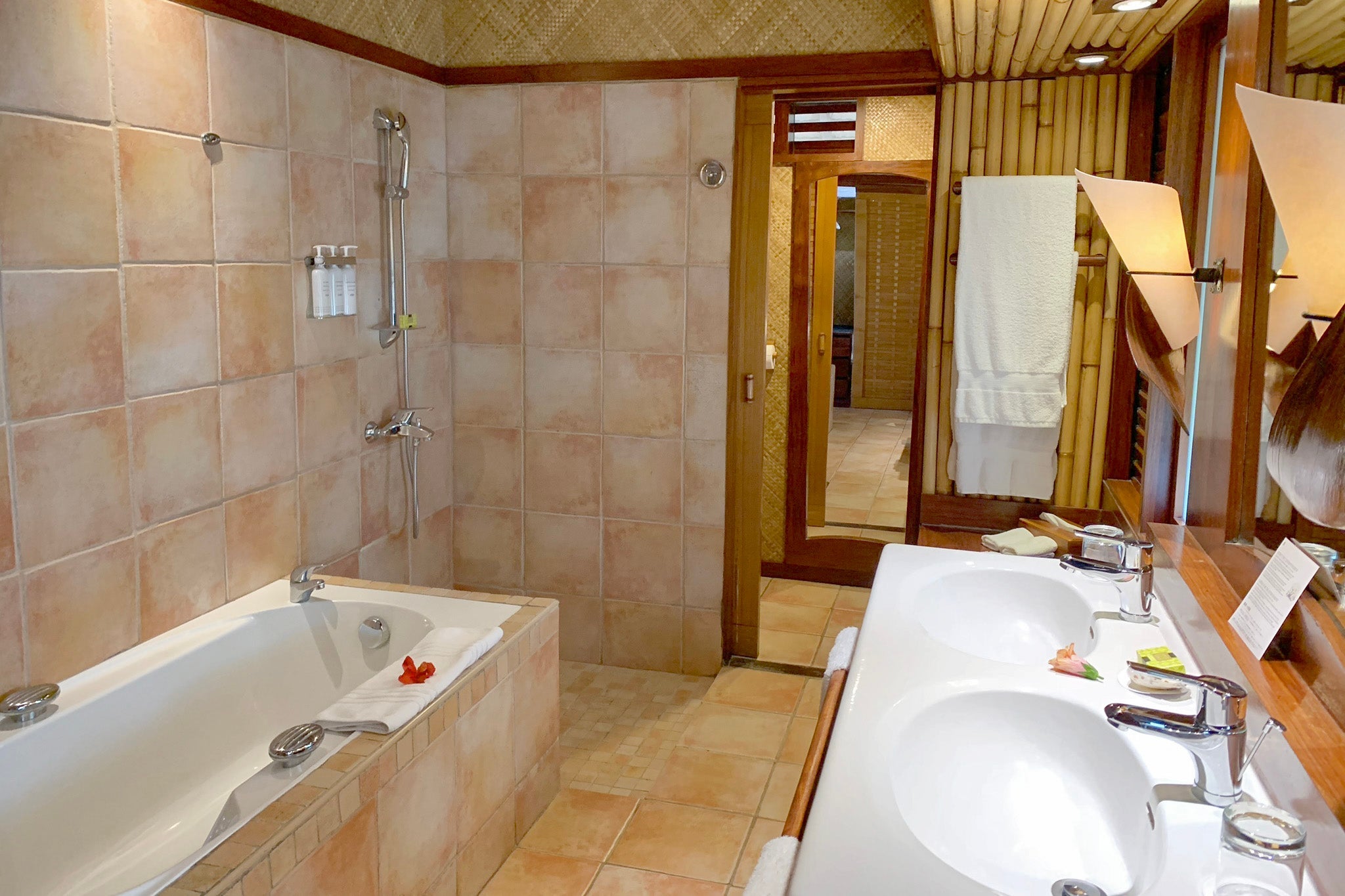 The bathroom was spacious and featured a standalone tub, an open shower and side-by-side sinks.