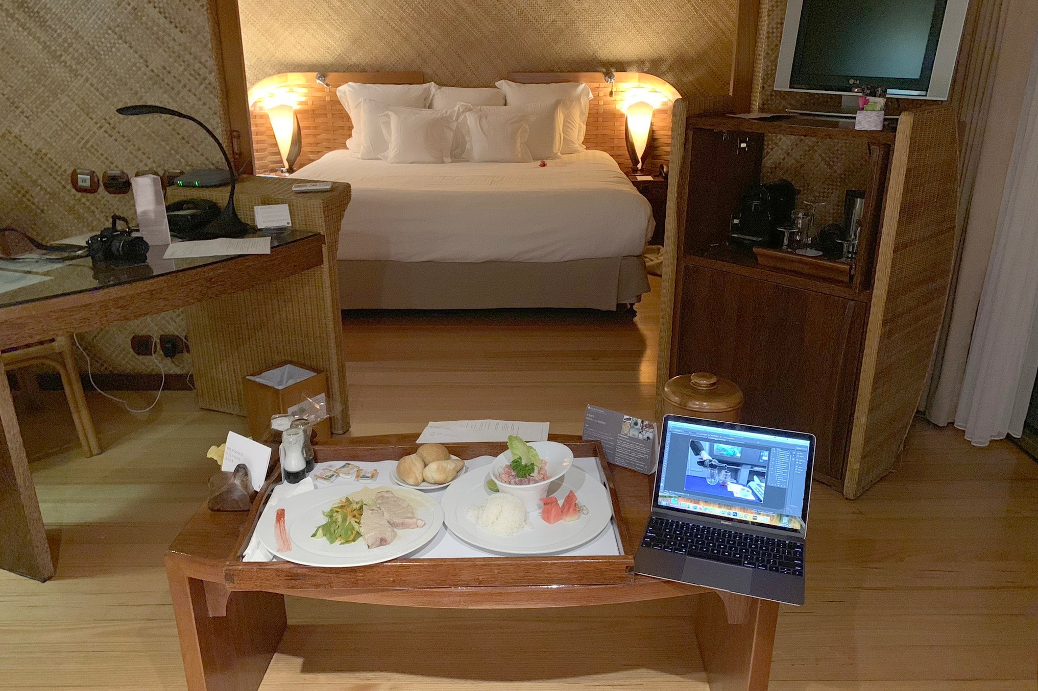As much as I loved Thalasso, it made sense to spend most of my time at Le Moana, since that's where I was sleeping both nights. I ordered room service on the first rainy night. After tax and a service charge, my poisson cru appetizer ($24) and tuna main course ($34) came to nearly $70. Hardly a bargain for fresh local fish, but not terrible for Bora Bora.