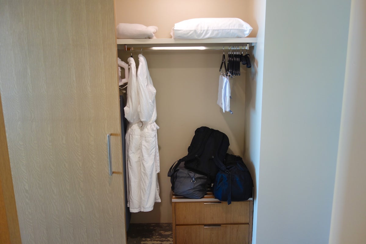 Back toward the front door, the closet was fairly large and contained two comfortable robes, hangers, drawers and an ironing board.