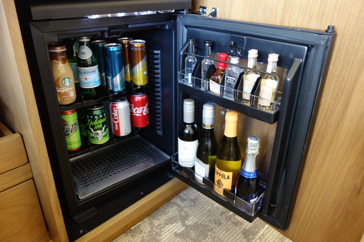 The drawers to the side held the minibar, which was well-stocked with drinks.