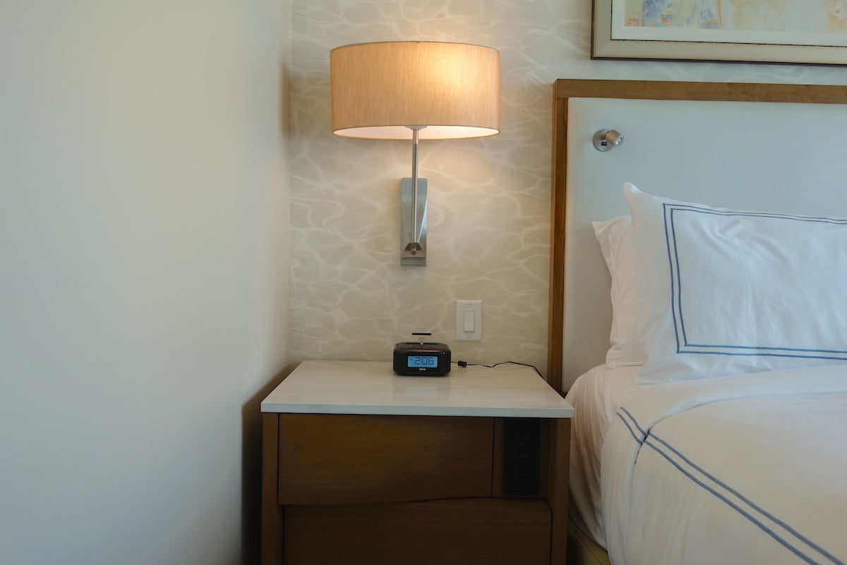 The nightstand on one side held a clock and the other the telephone. There were two power outlets and two USB ports on each side, and one of the drawers held the room safe.