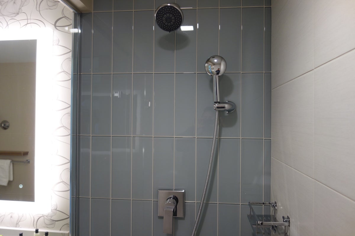 Though spacious, it was not the most impressive bathroom. The toilet was right next to the sink, and there was just a shower, no bathtub. The sink counter was large, so you could spread out your toiletries. I also liked the two blue glasses.