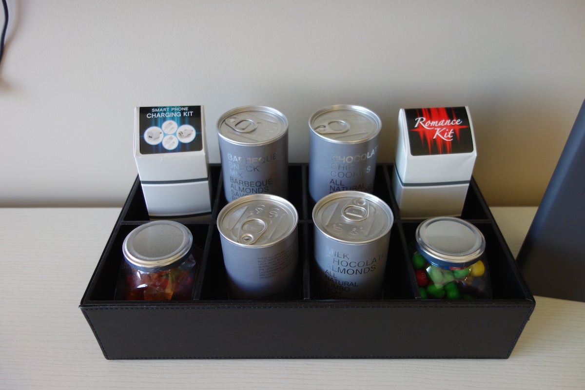 On the counter, meanwhile, were various snacks like gummy worms and almonds, plus a charging kit and a "Romance Kit" in case you needed certain items for an evening in.