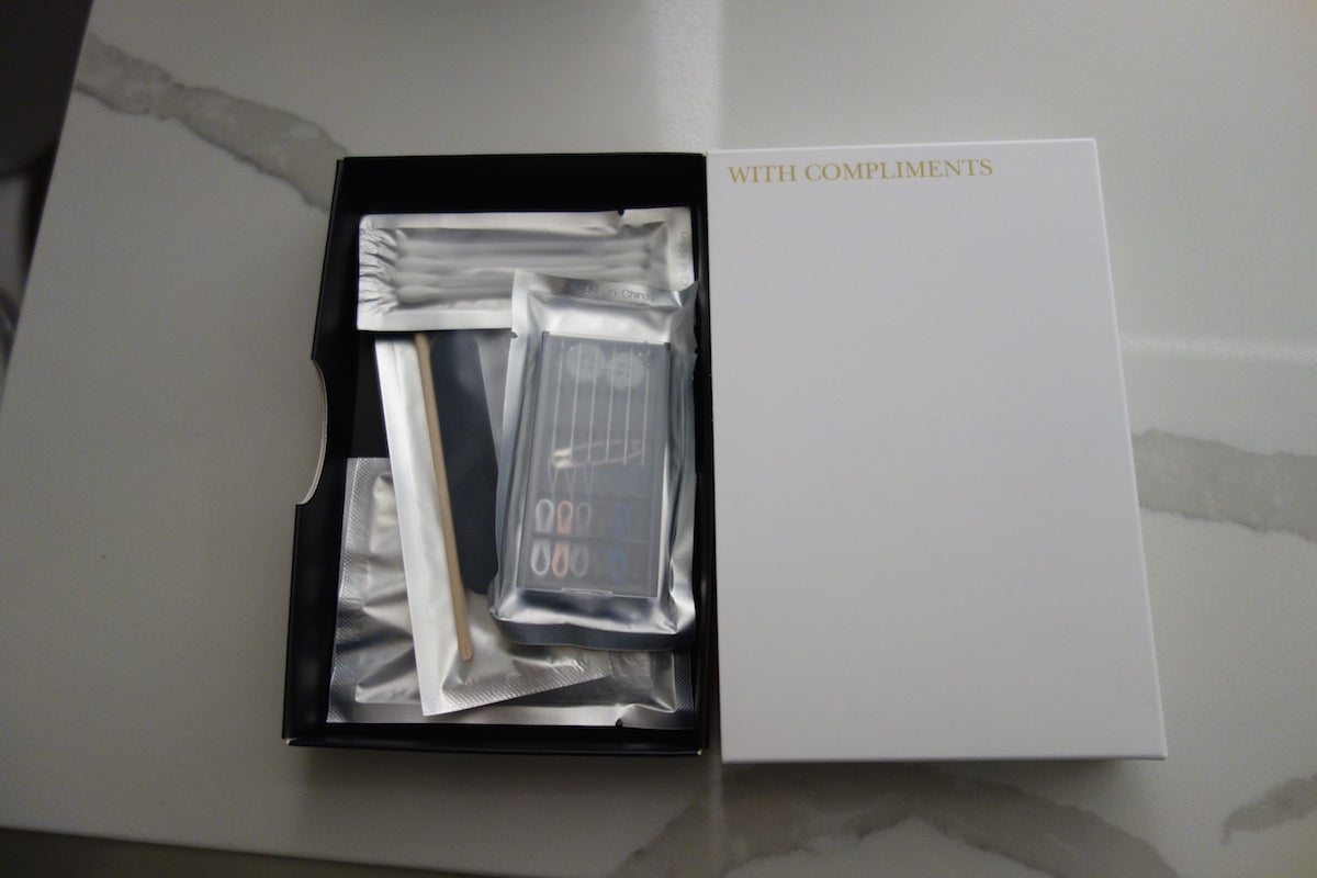 There was a box of complimentary amenities including a nail kit and a sewing kit.