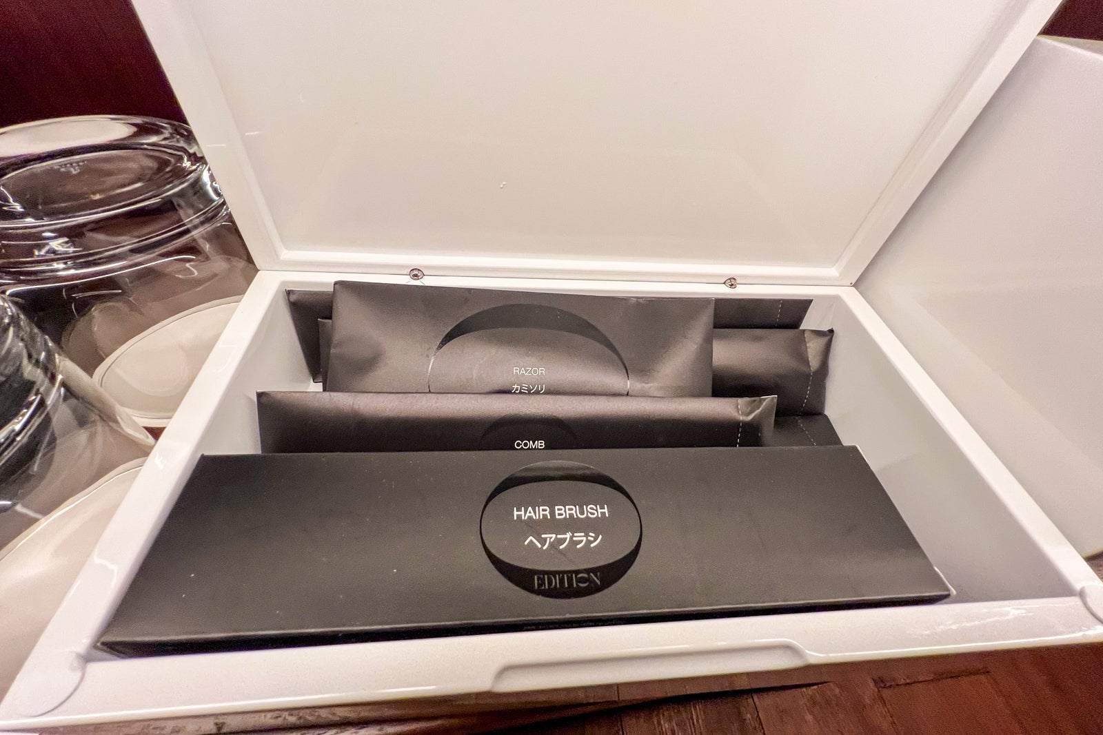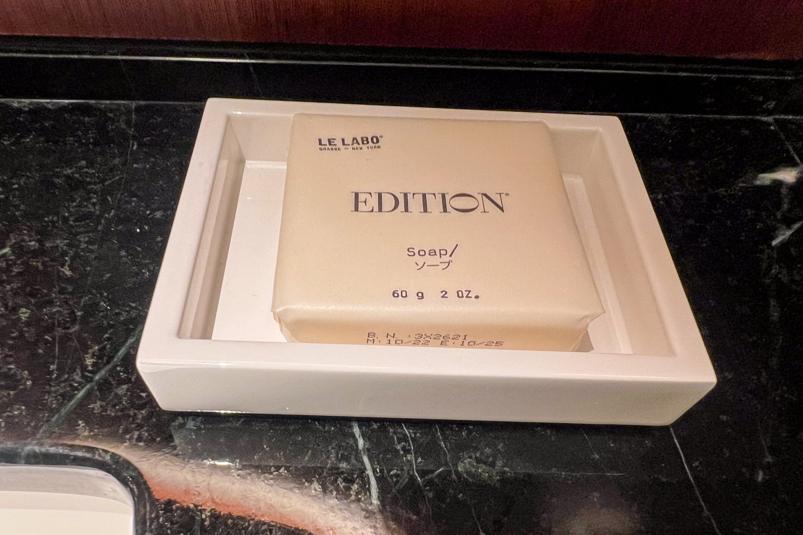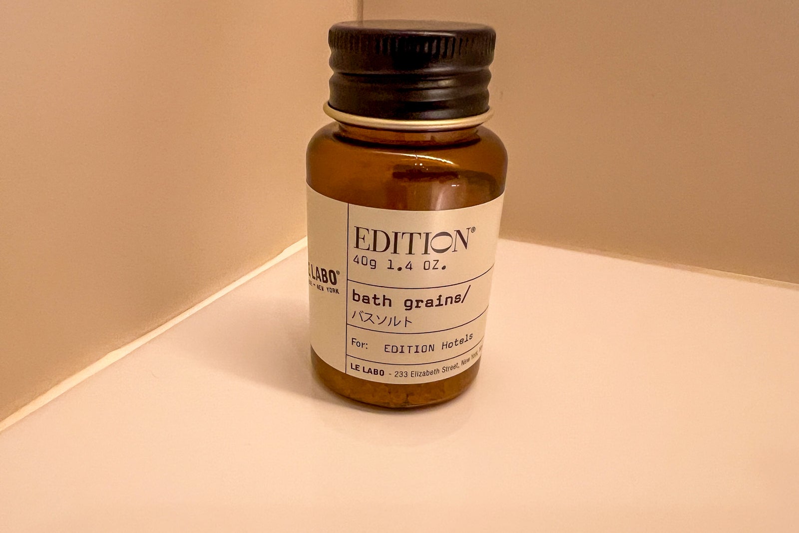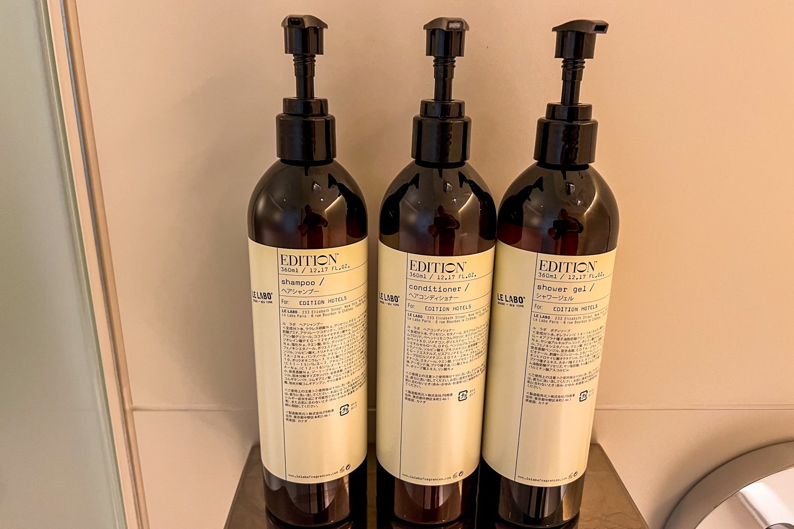 Behind a glass wall, an Asian-style spa suite held both the walk-in shower and a bathtub, which is common in Japanese luxury hotels. There were both handheld and overhead showerheads, and it was stocked with Edition's exclusive black tea Le Labo toiletries, with their distinctively woodsy scent.