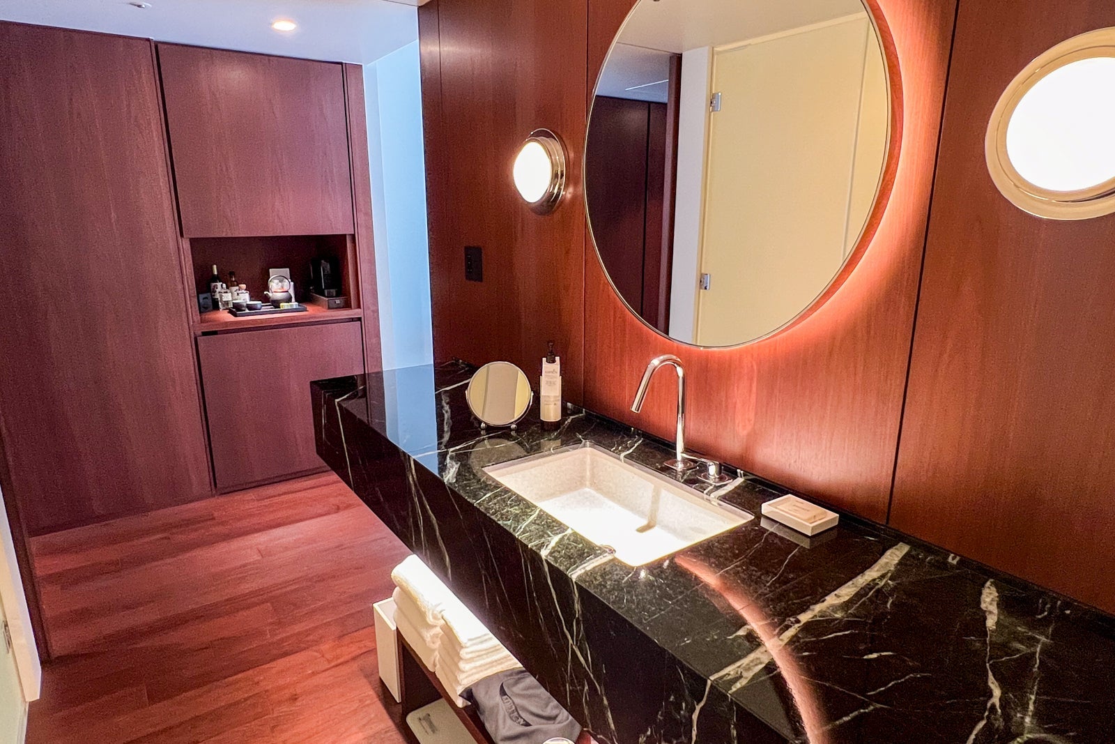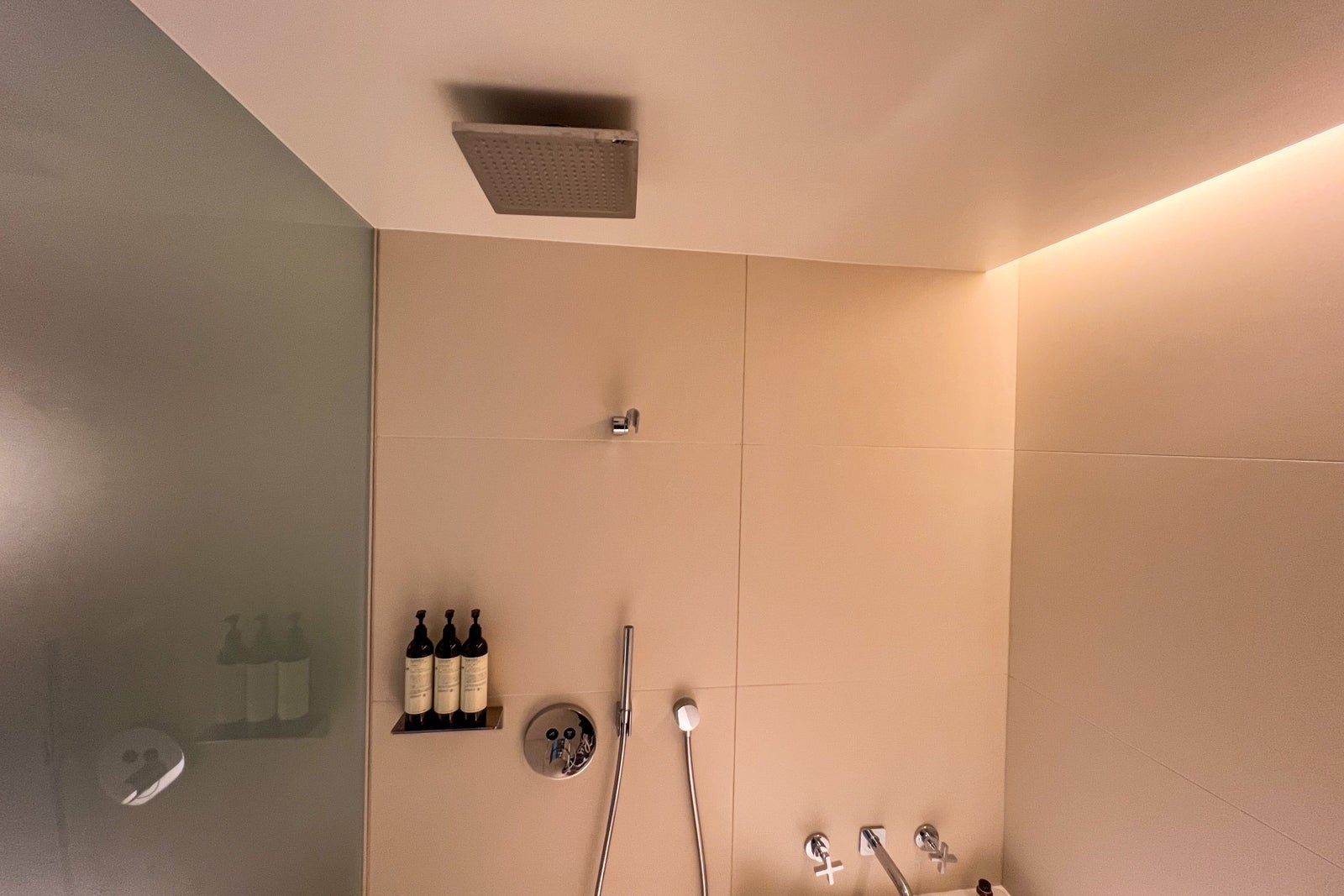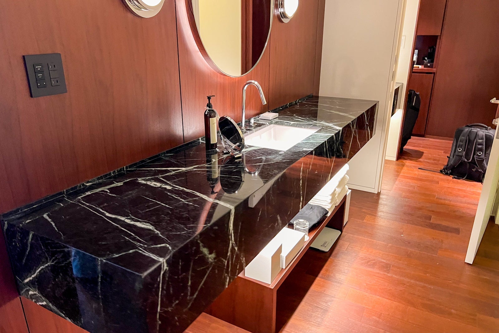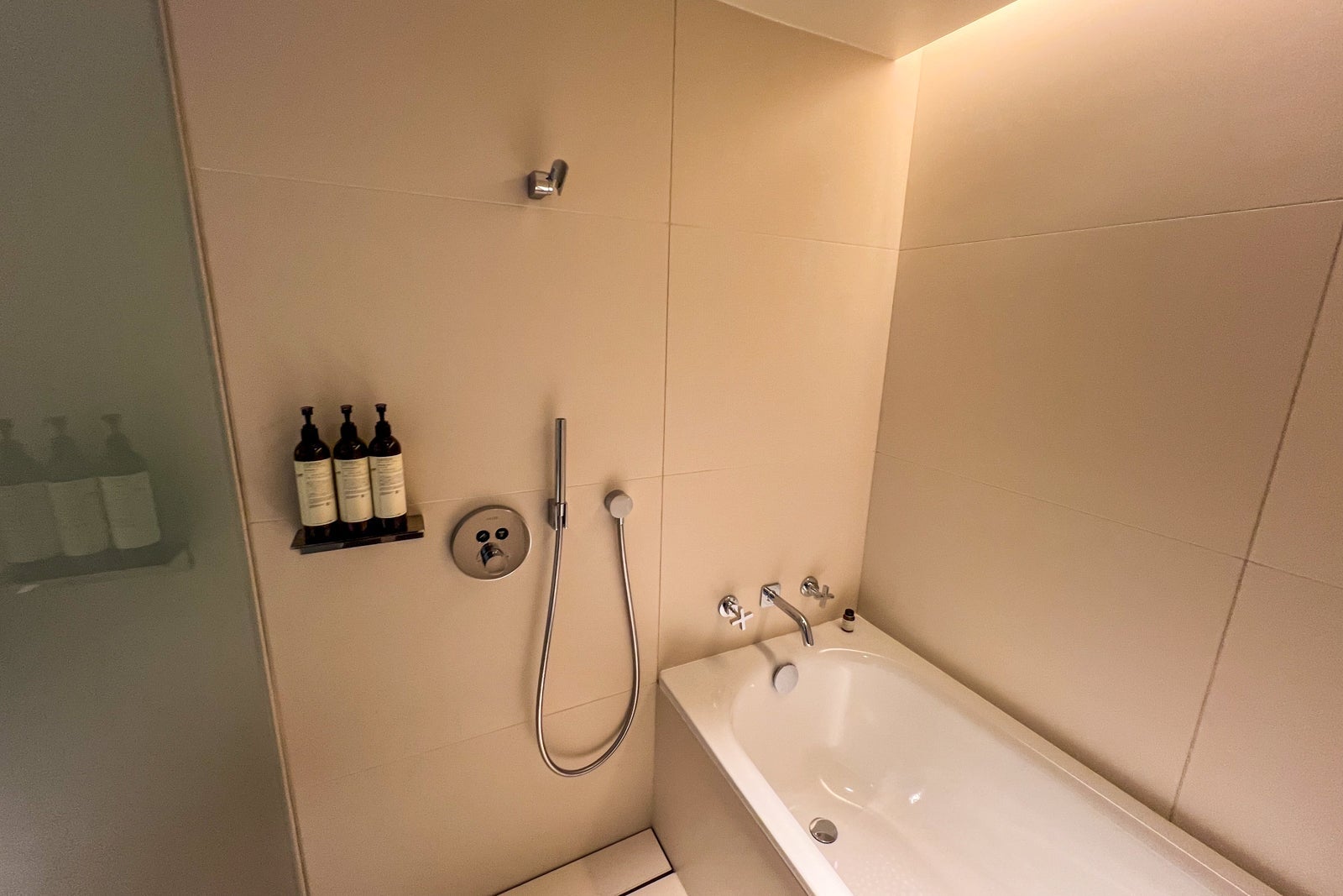 Behind a glass wall, an Asian-style spa suite held both the walk-in shower and a bathtub, which is common in Japanese luxury hotels. There were both handheld and overhead showerheads, and it was stocked with Edition's exclusive black tea Le Labo toiletries, with their distinctively woodsy scent.