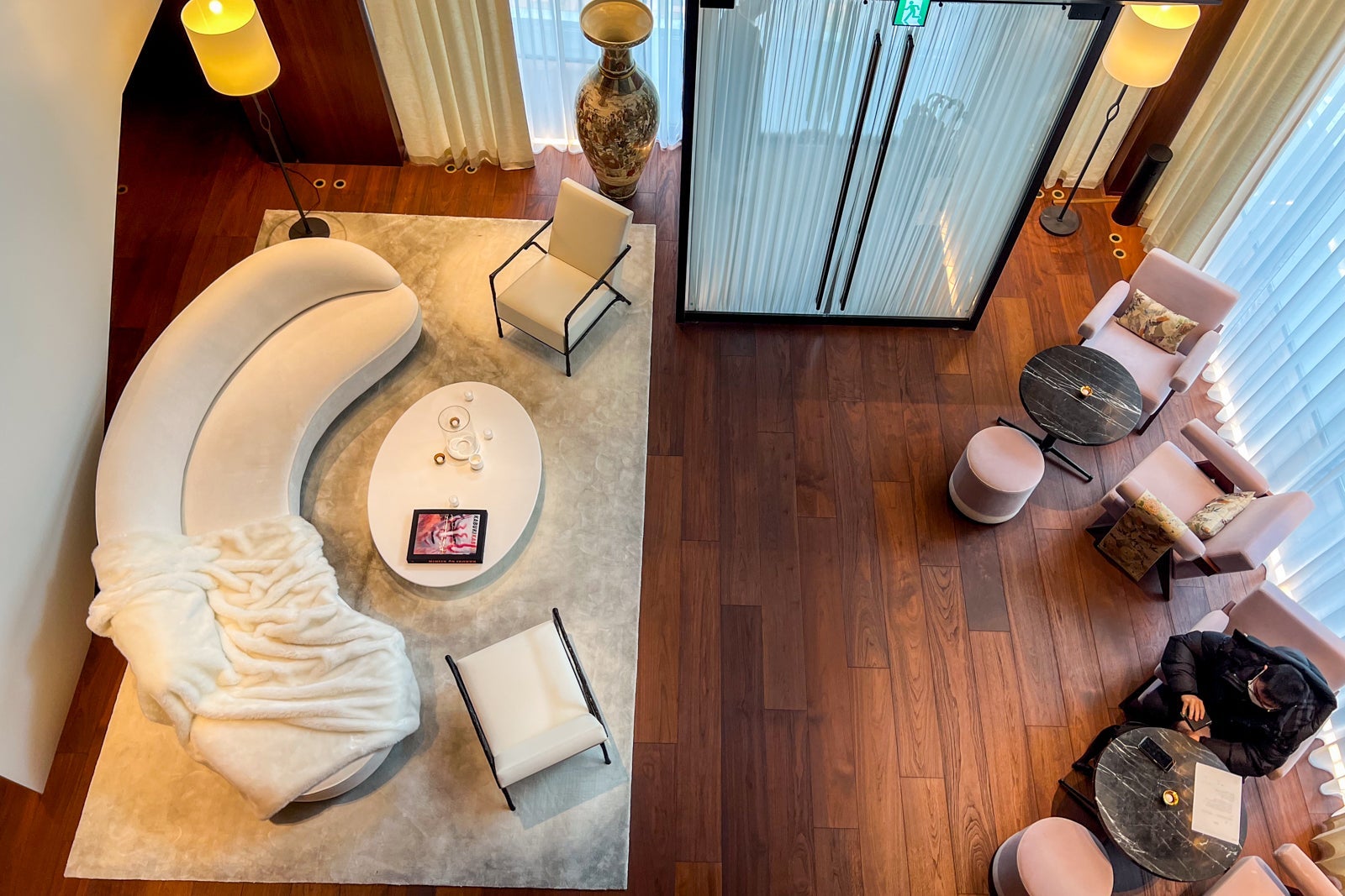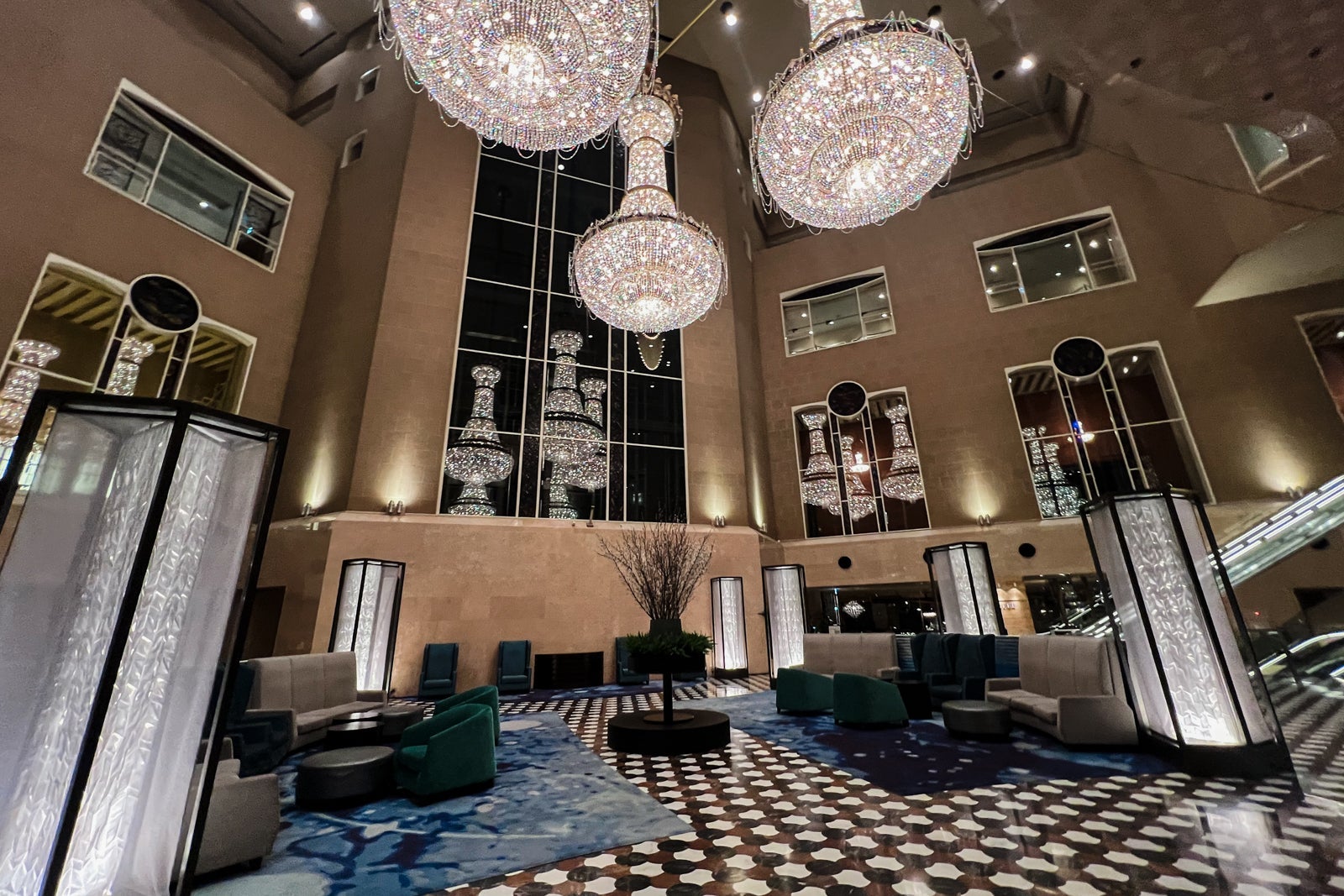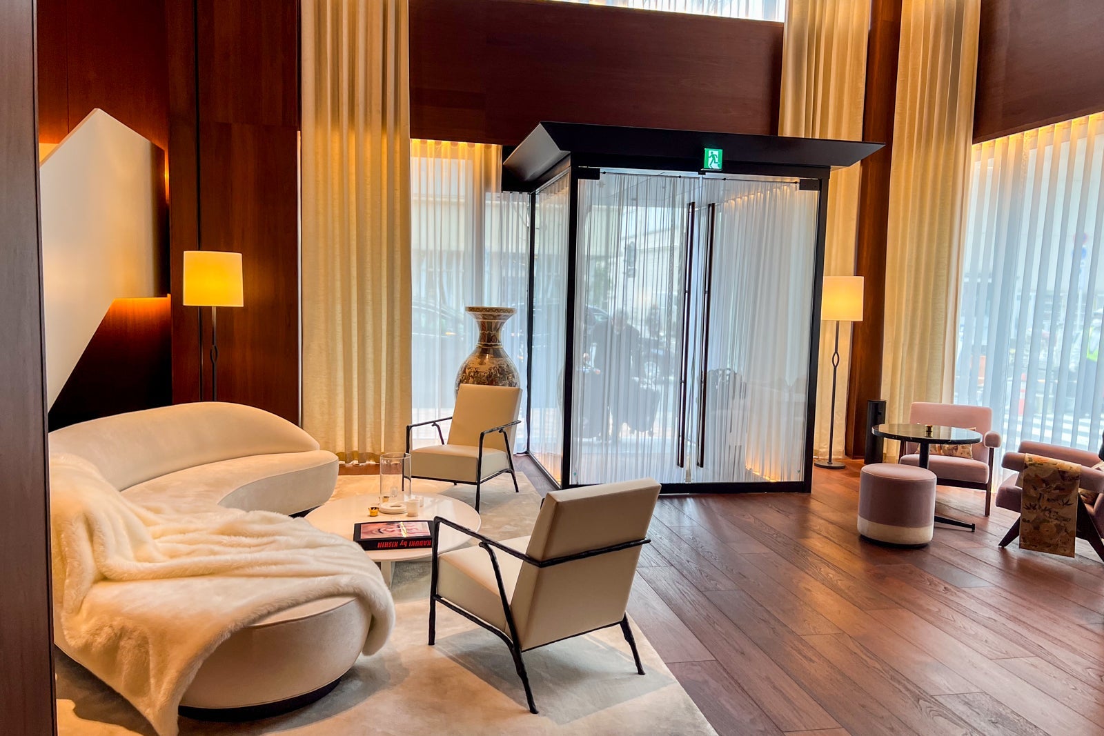 Guests enter through a two-story lobby paneled in warm-toned wood with gold accents, white furnishings and sheer draperies, a stark contrast to the streets outside.