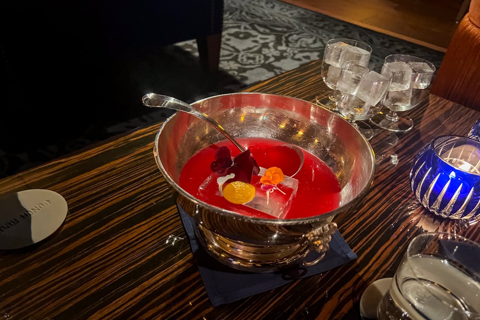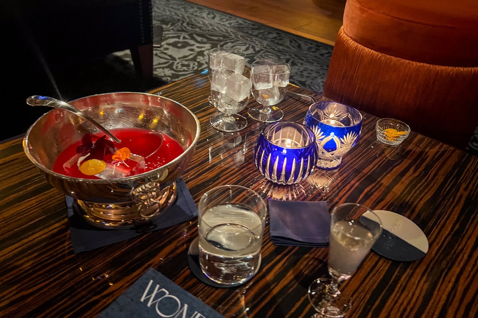 The overriding concept was "Wonderland," described by the menu as "an exploration, in the form of punches, of Japanese culture as seen through the eyes of the outside world." My companions and I tried a nonalcoholic version of Edition's Sakura Cosmo with shiso tea, sakura (cherry blossom), cranberry, citrus and botanicals served in the famous punch bowl. It costs $12.52 for a glass. You'll also find Japanese ingredients like Aomori apples and umeboshi plums in some of the drinks.