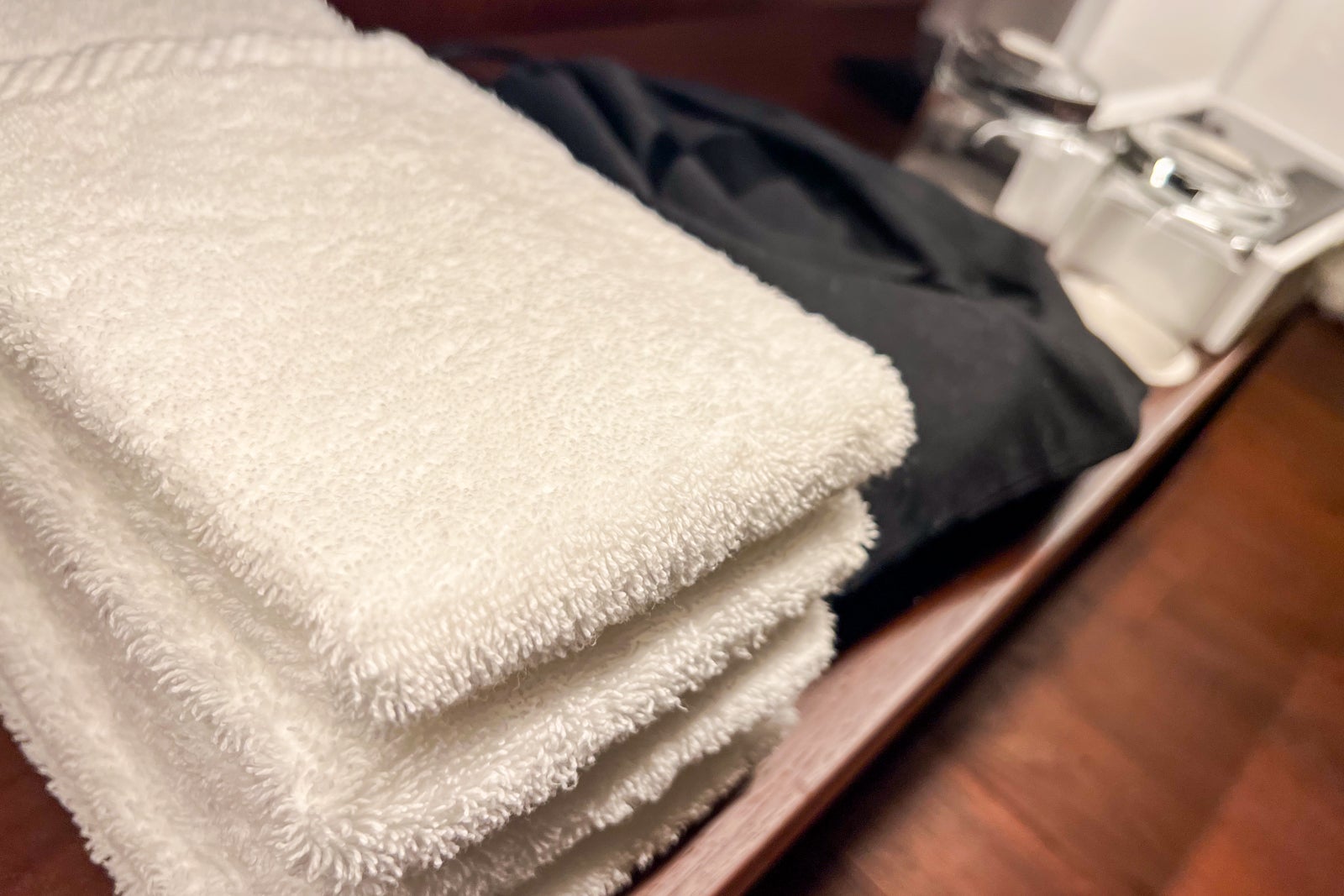 The bathroom, just off the entry foyer, contained a single sink embedded in a dramatic, green-veined marble slab. Along with a scale, the hotel provided a few basic toiletries in case you left any of your own at home and some fluffy Canasin towels.