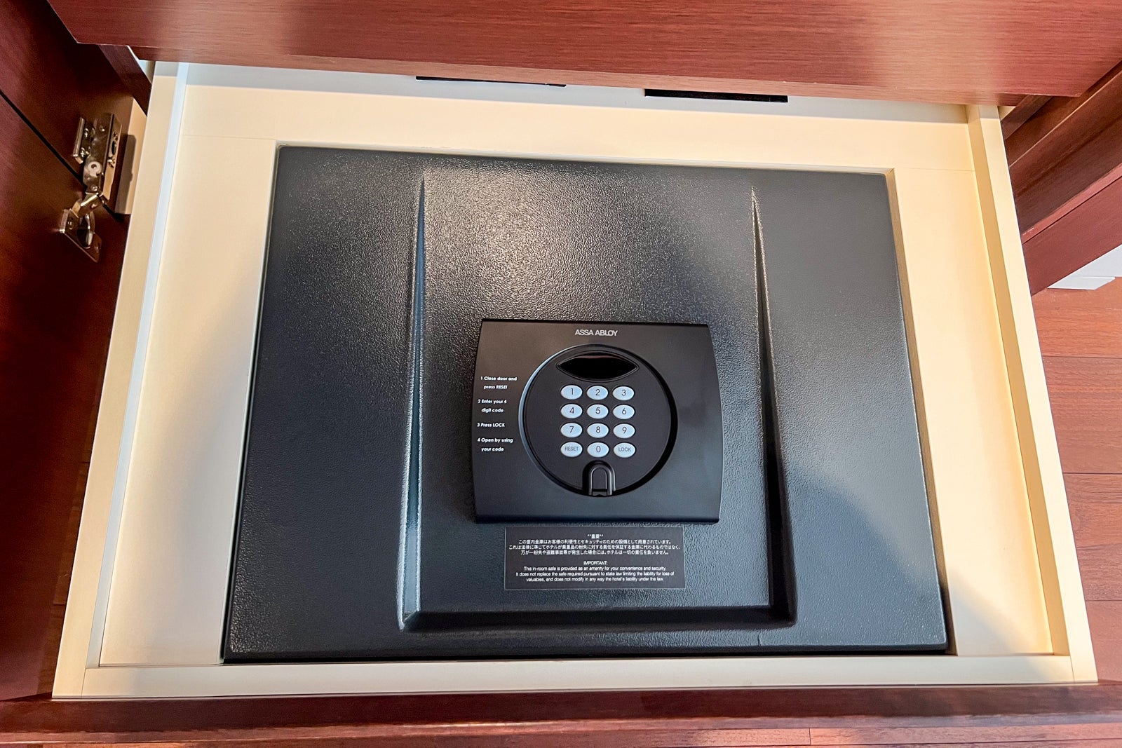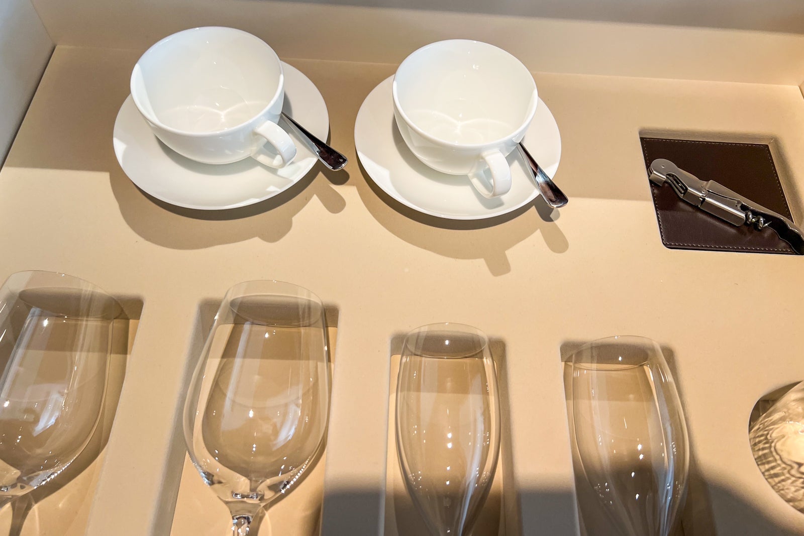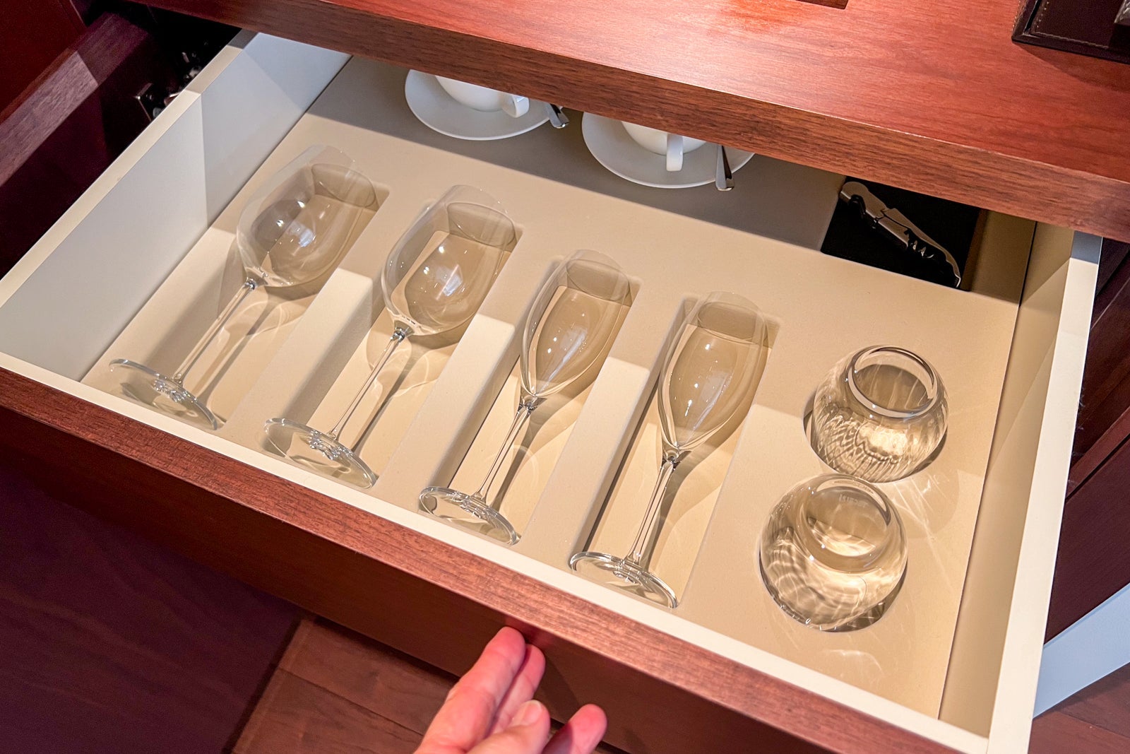 A series of drawers under the minibar held glassware, salty and savory snacks, and the room safe.