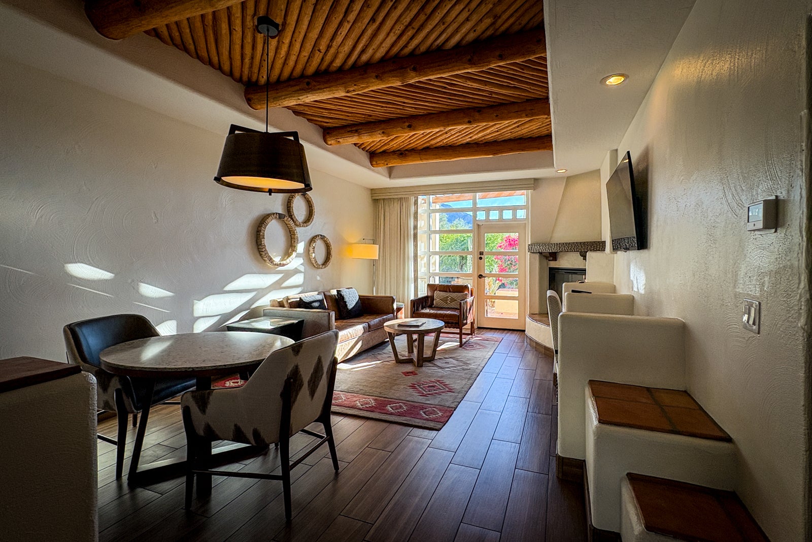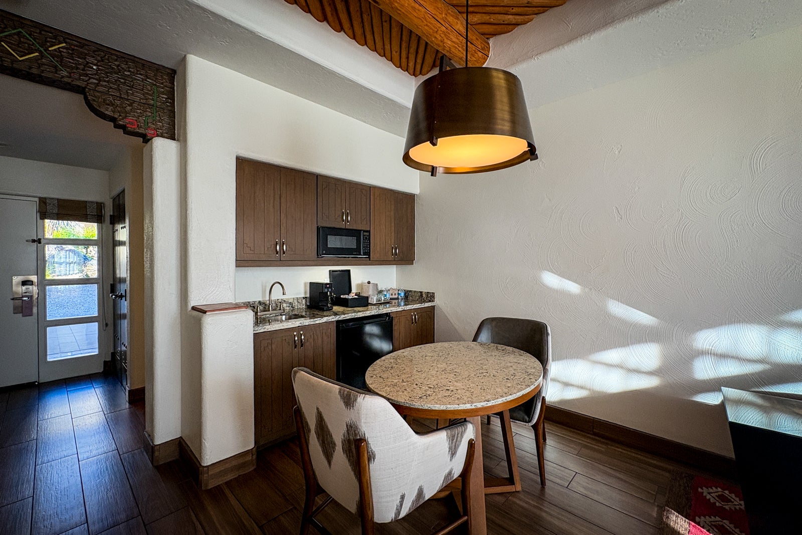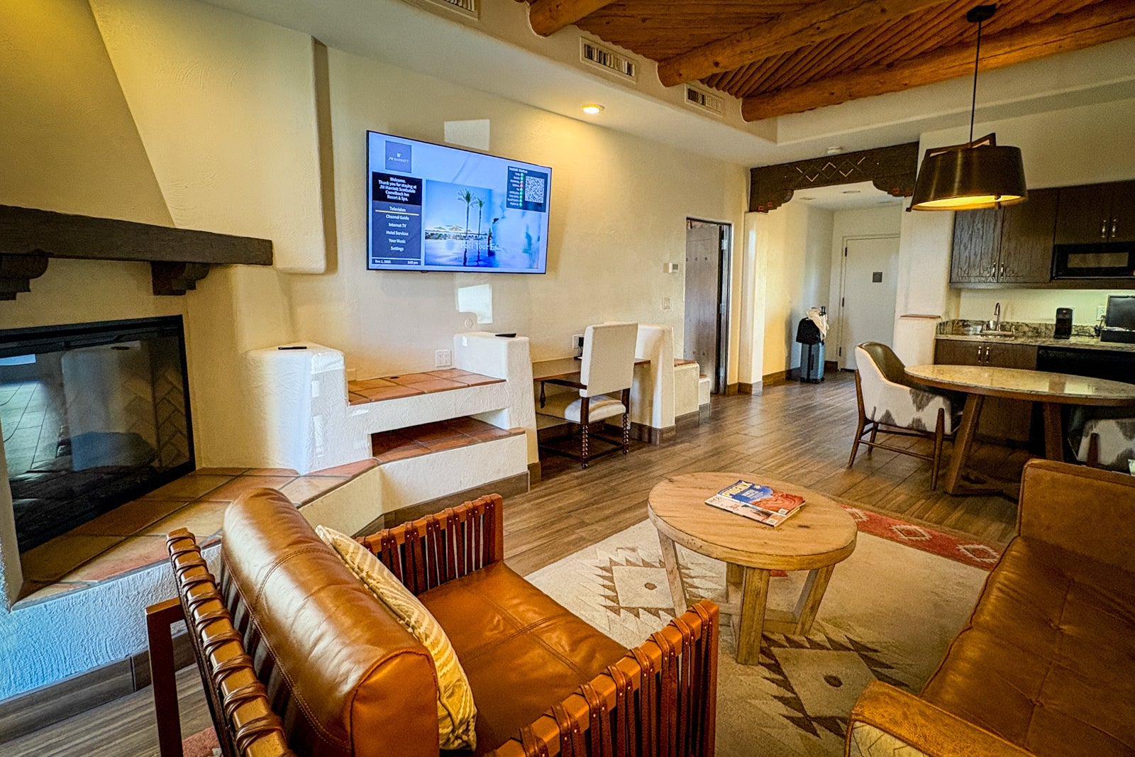 On this visit, I stayed in a mountain-view one-bedroom suite adorned with southwestern decor, featuring one and a half baths and a living room with an adobe-style gas fireplace. The dining area featured a a coffee maker, a full wet bar and a stocked mini bar. A detail I appreciated was the two different patios: one off of the living room and the other off of the bedroom. This was lovely for enjoying the morning sunrise view over Camelback Mountain with a cup of coffee.