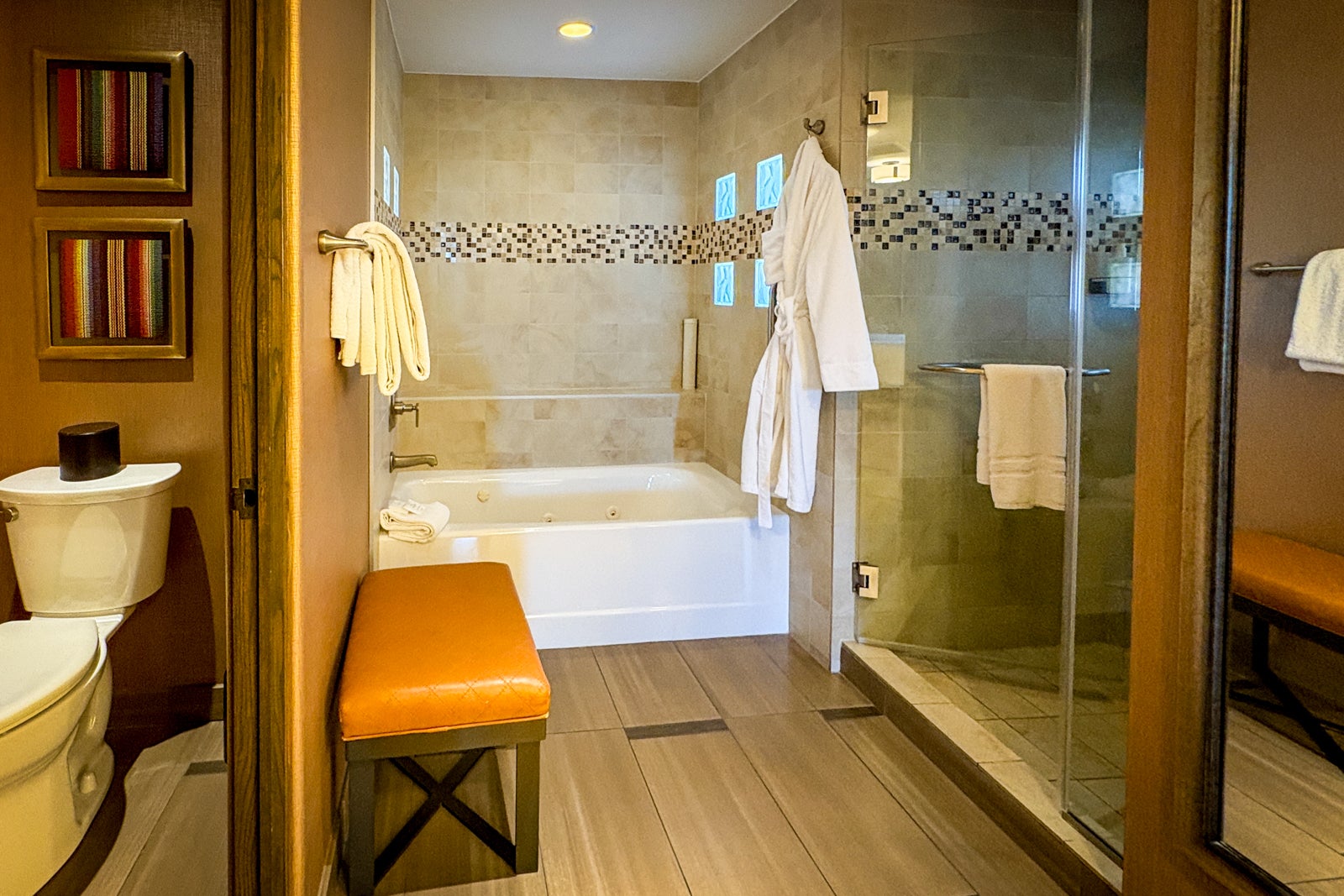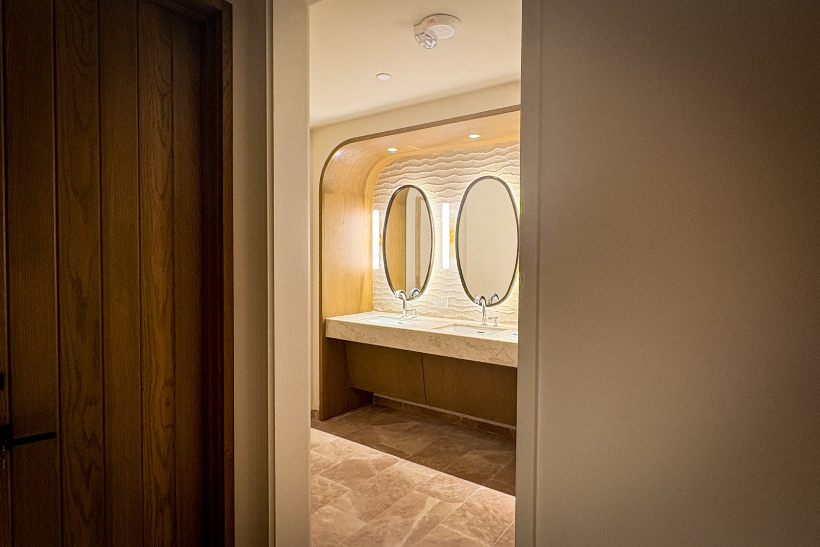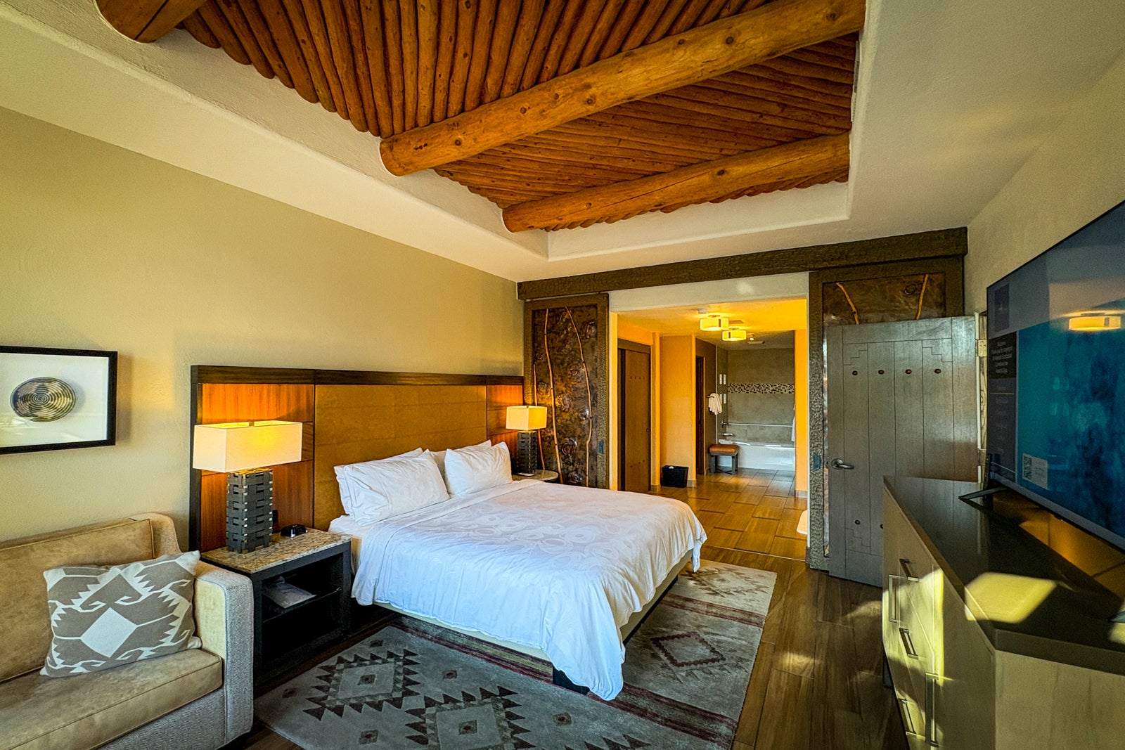 The huge bathroom — separated from the bedroom by double sliding doors — included a tub, separate shower, double vanity and full closet. Bath amenities pay homage to the calming scents of the desert, courtesy of Aromatherapy Associates London.