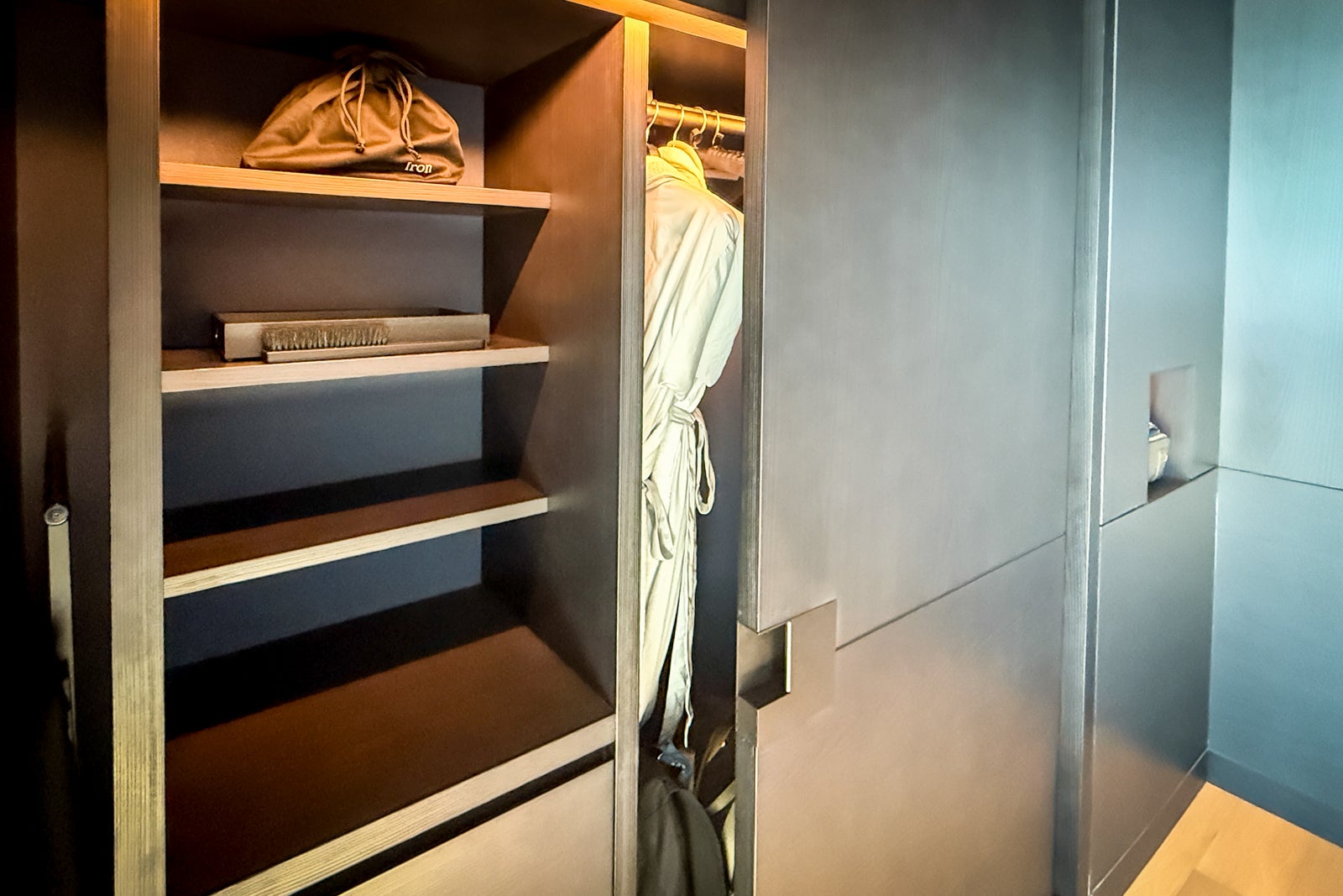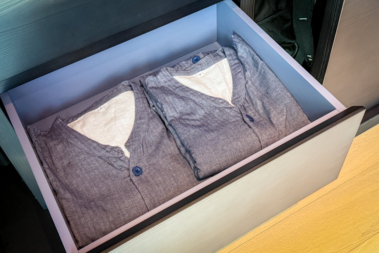 The room featured an entryway with closet space and a built-in space for your suitcase. By the door, a small cubby made for a perfect place to drop your wallet and key, with a visual cue to take it with you on the way out. Inside the closet, a secret pair of pajamas was waiting for me to change into.