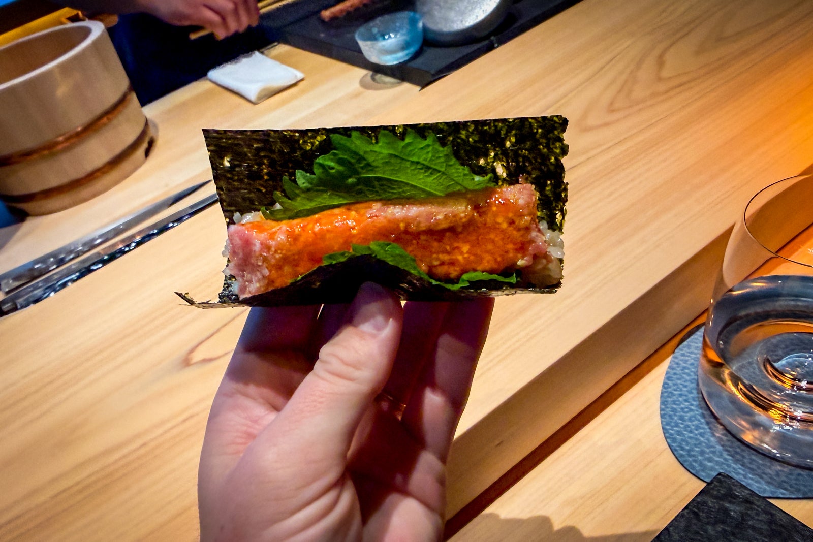 Though every omakase experience is typically different (omakase basically means chef's choice and is based on the freshness and seasonality of ingredients available), I still can't stop thinking about two dishes: Osetra caviar and Hokkaido hairy crab with Shanghai crab sauce and the signature chutoro and otoro hand rolls with spicy flavor, roasted Sichuan pepper, pickled daikon radish, white onion and shisho leaf so delicately crafted one could argue that this omakase experience is really dinner and show.