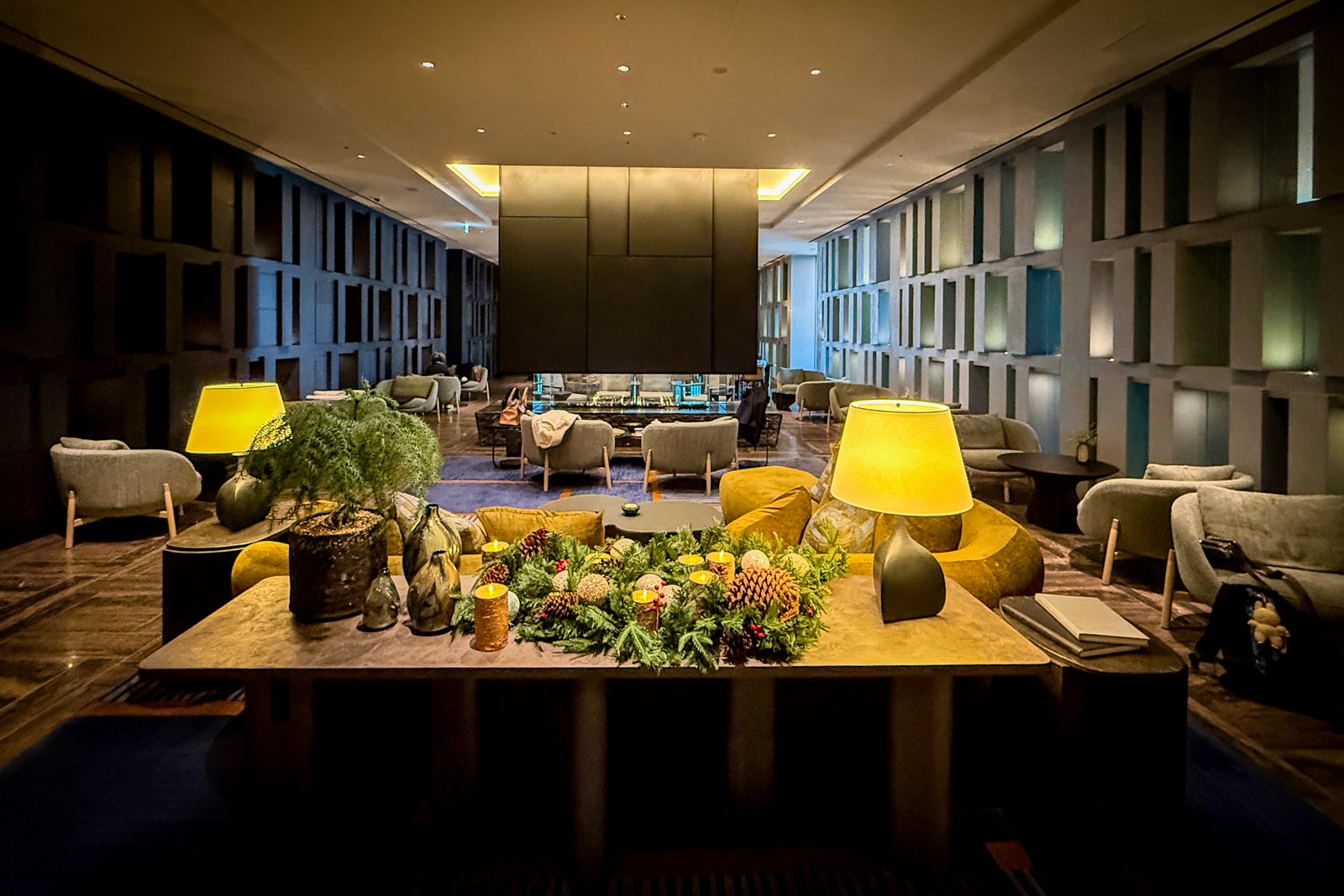 As is common at many Tokyo hotels, guests who arrive at the JW Marriott Hotel Tokyo by car come to a garage-like entrance and are sent up an elevator to a sky-high reception floor. But before hopping on that elevator, a quick stroll through a serene, moodily-lit corridor perfectly sets the scene for the entire hotel: dark woods contrasting against shiny stone materials and pops of earth-toned color, greenery tucked away in unexpected spots, and friendly staff members waiting to assist around every corner. Not to mention incredible art throughout, like a massive futuristic replica of Mount Fuji hanging from the ceiling.