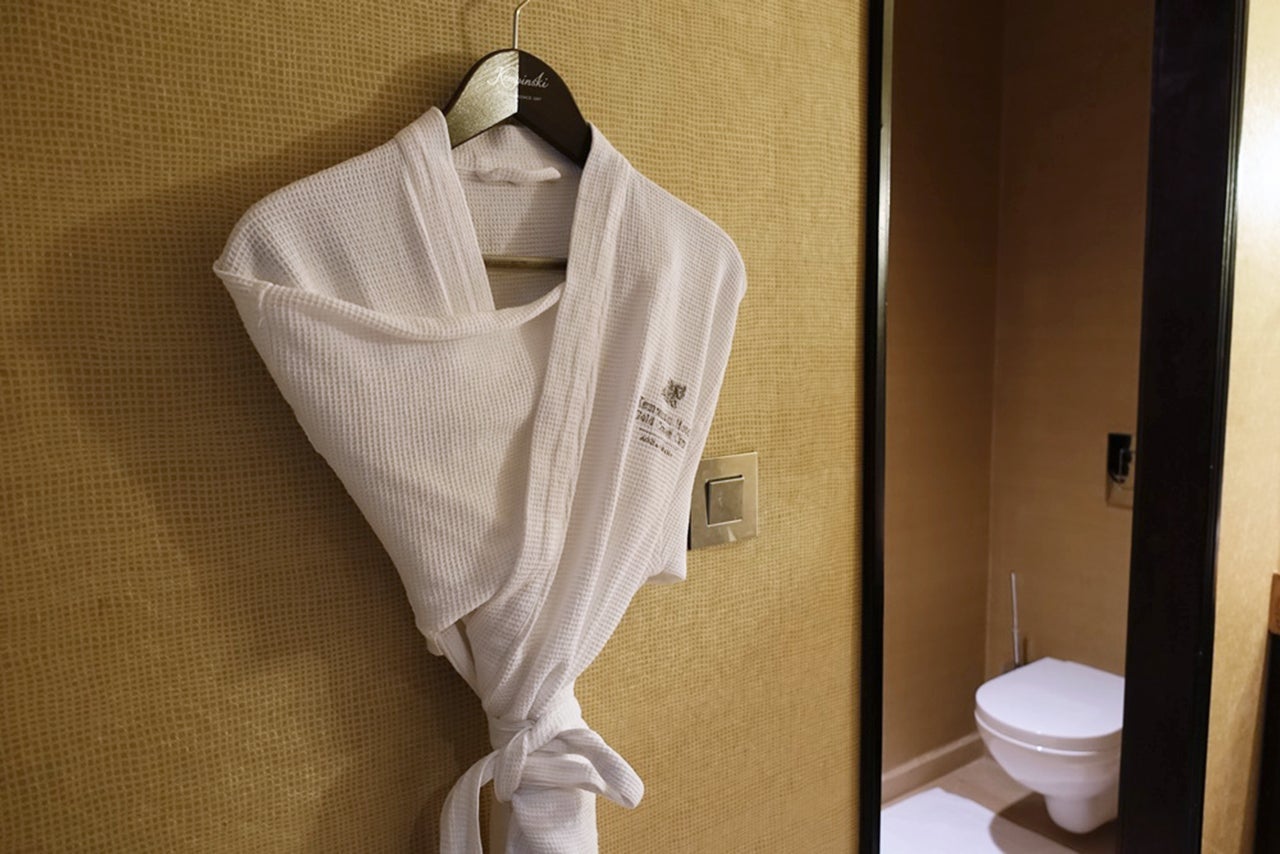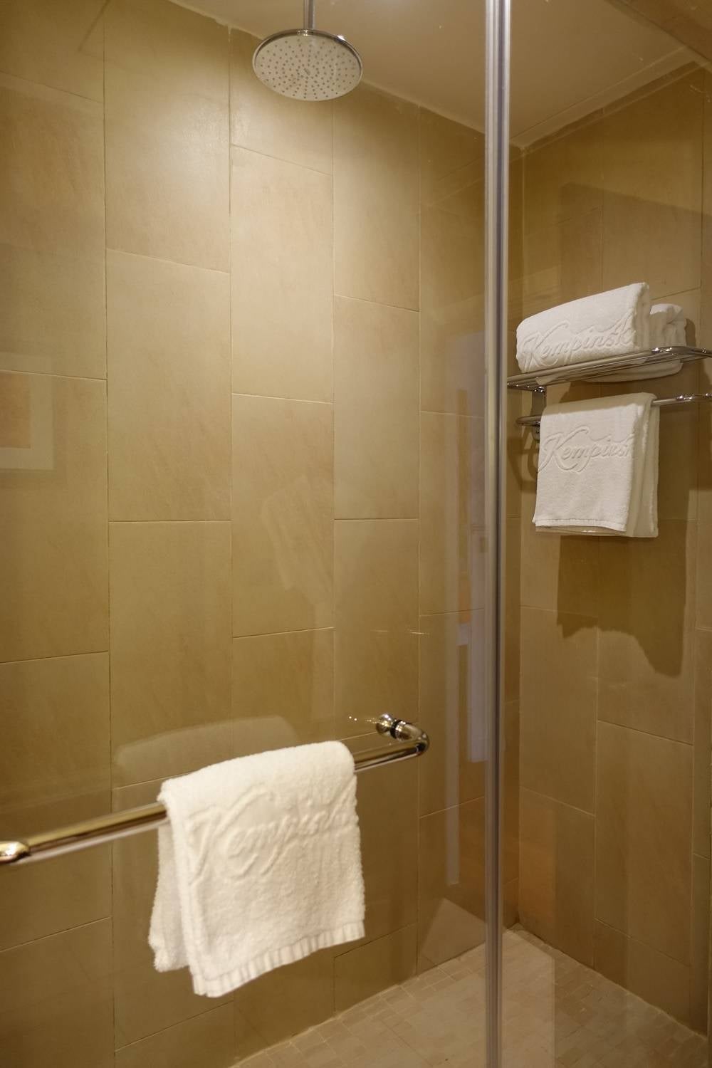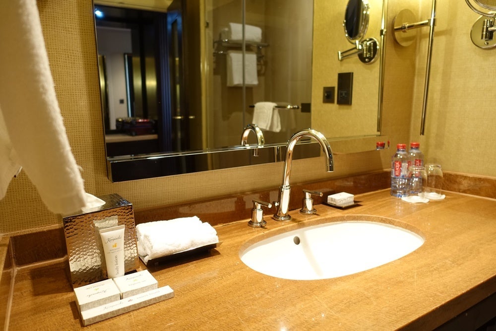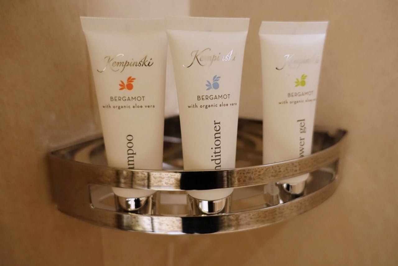 Although there was only one sink, the counter had plenty of storage space for toiletries. The Kempinski toiletries provided (which I actually needed to use, as my luggage was missing) smelled wonderful — bergamot with organic aloe vera.