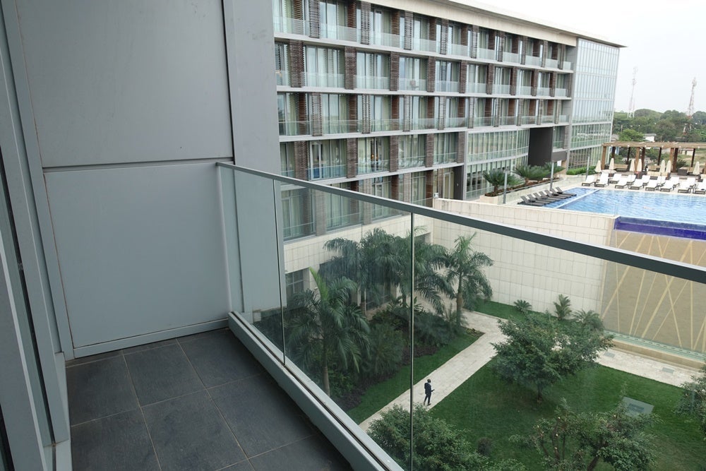The floor-to-ceiling windows provided expansive views of the pool and courtyard. There was also a balcony but no furniture on it, so I didn't spend any time out there.
