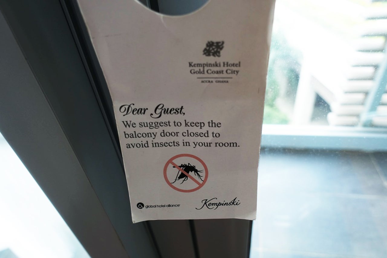 A sign on the door warned me to never leave the door open, as insects would enter the room. The fear of malaria was real, and many people, doctors included, suggested I take malaria pills even for my short stay. In the past I've had adverse reactions to Malarone, so instead I wore insect repellent with DEET and covered up. (I didn't get a single mosquito bite during my four-night stay, for the record.) I didn't see a single insect inside my room or anywhere in the hotel, though I definitely wasn't sleeping with my balcony door open.