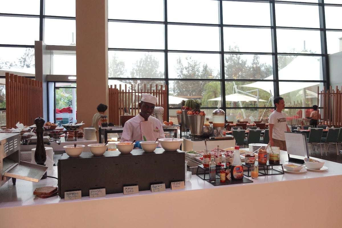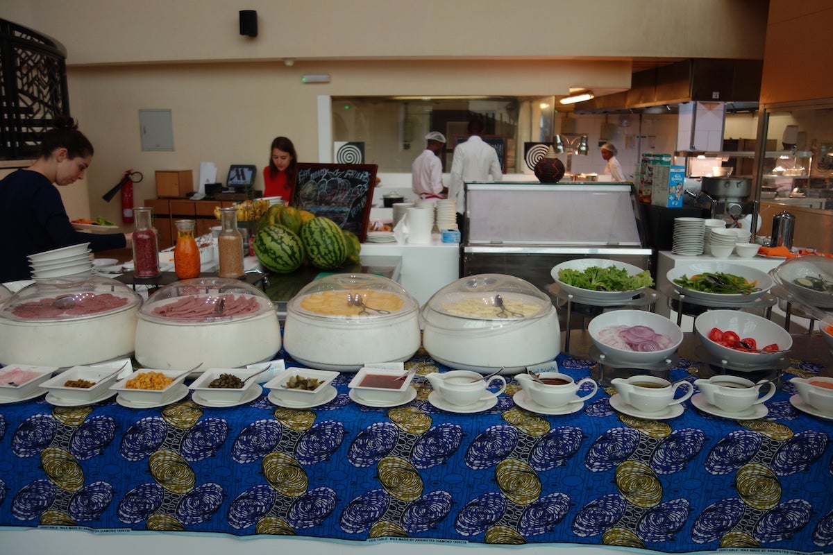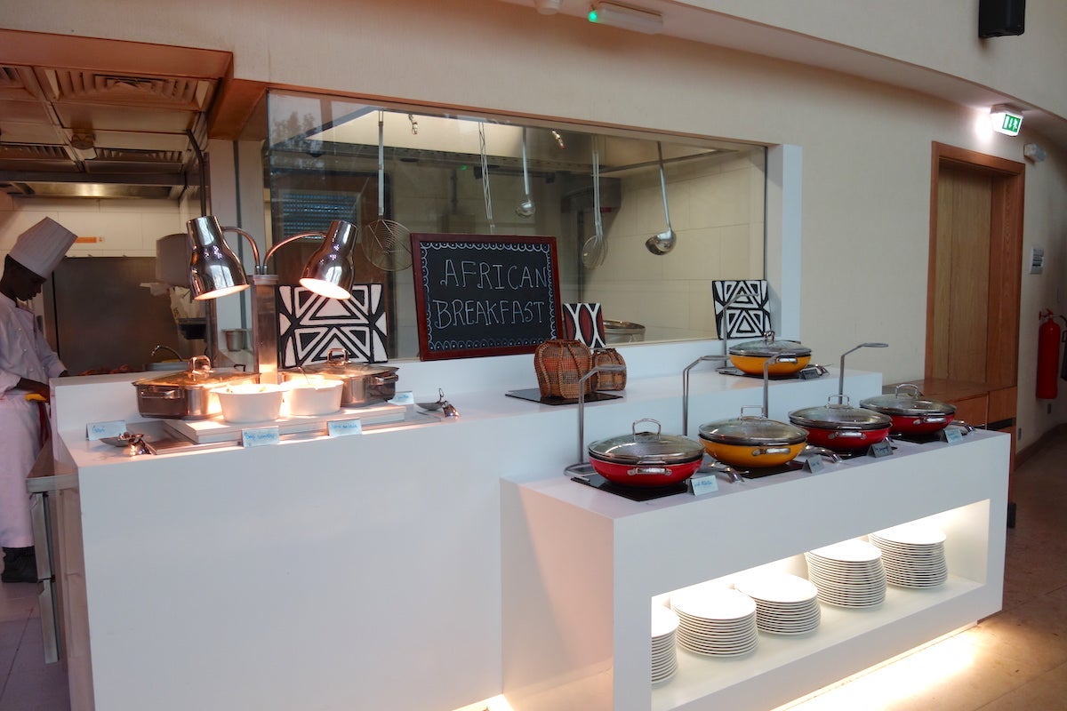 The spread was extensive, with separate stations for fruit and pastries, cold cuts, and African breakfast, including things like baked fish and onion rice.