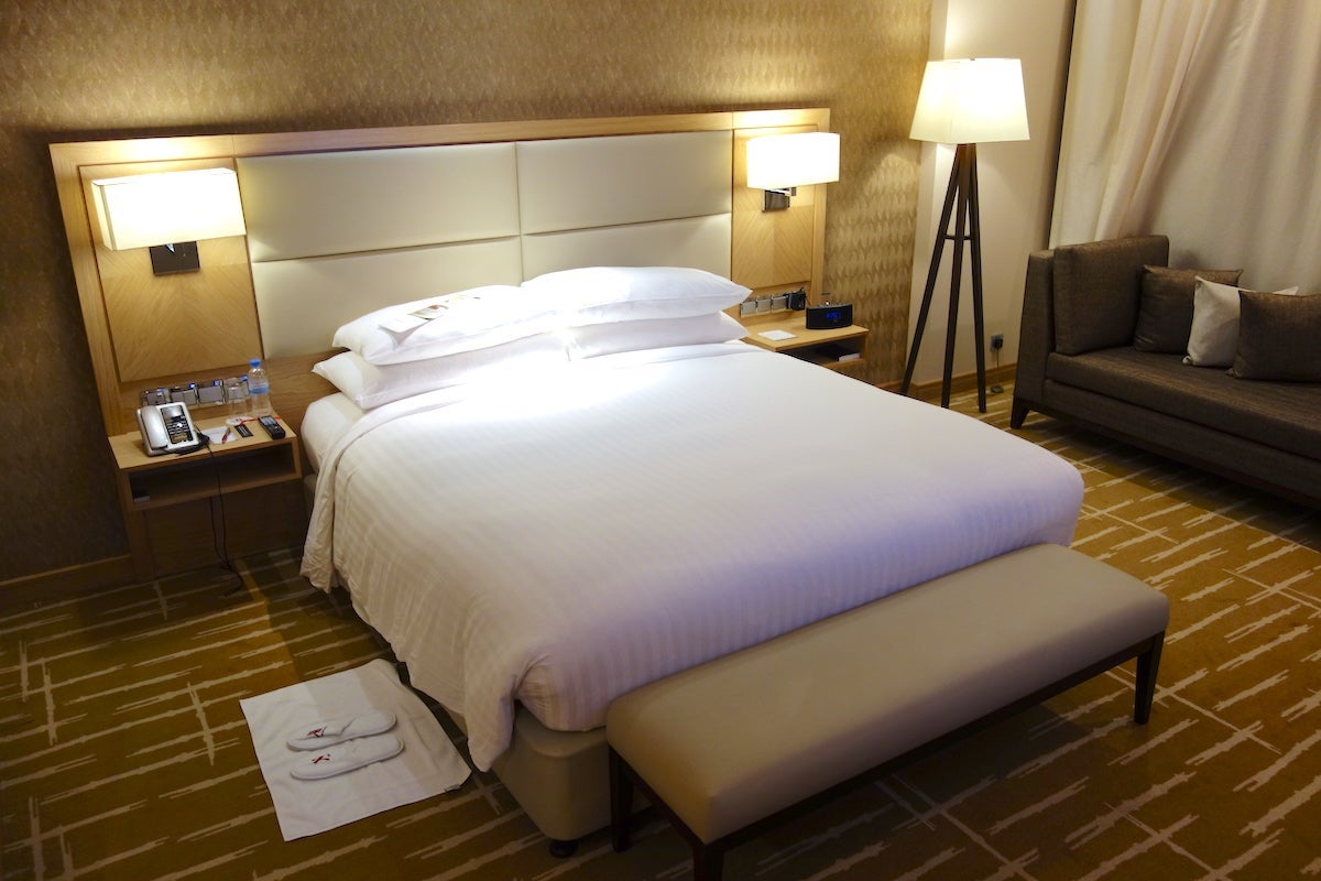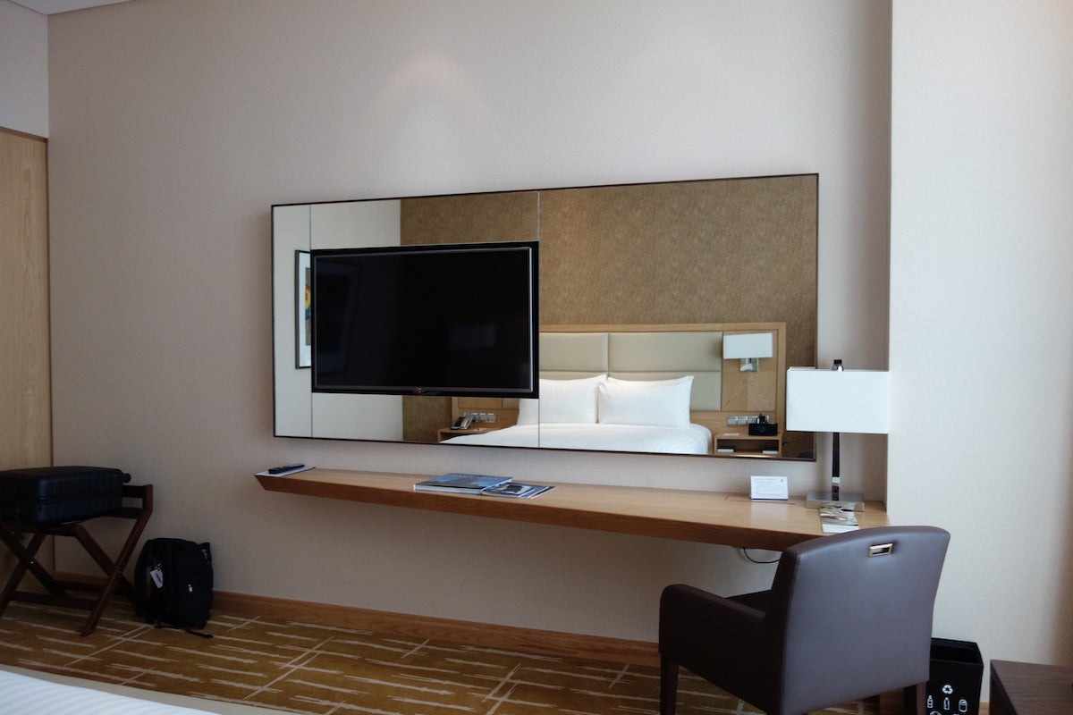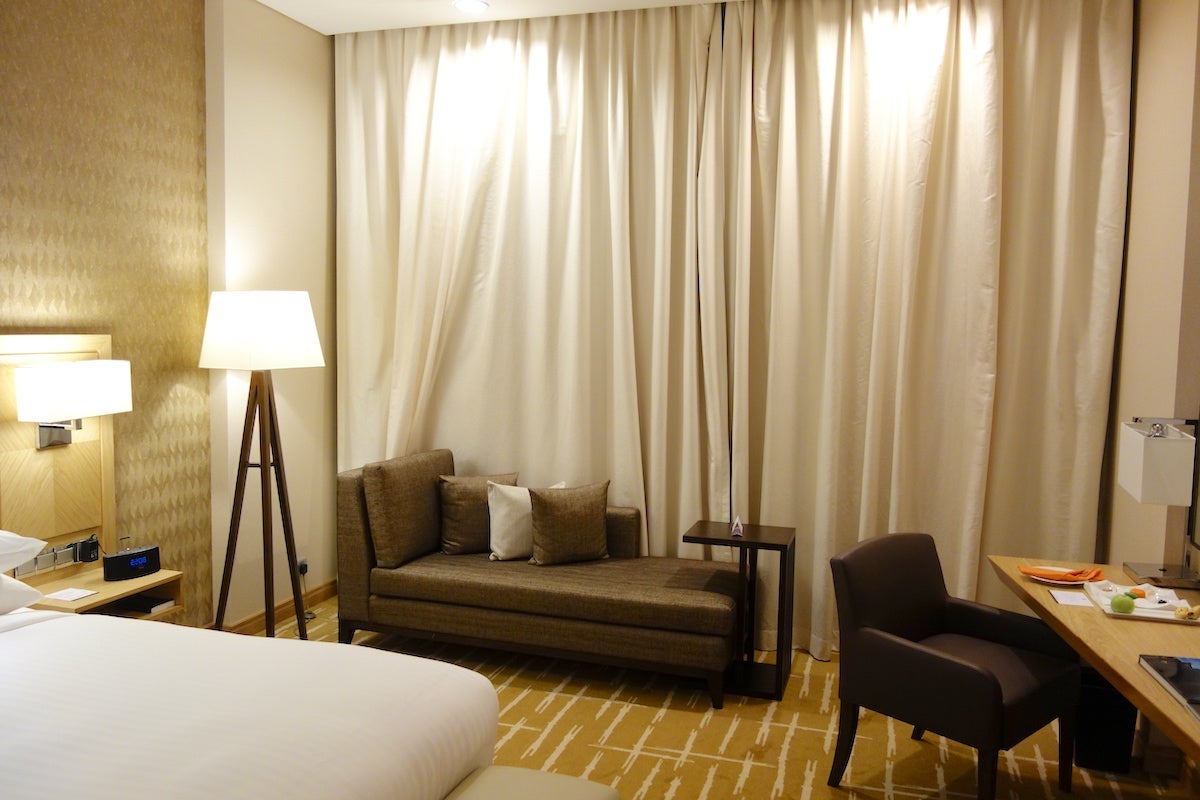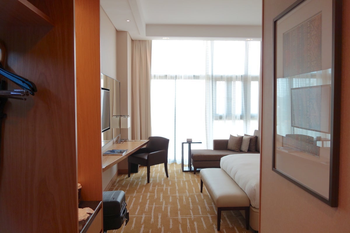 I'd originally booked a regular guest room with a panoramic city view, but as I mentioned, I was assigned an executive-lounge-access room, just without the lounge access. These looked like they had a slightly different layout, with a larger desk and a chaise lounge along the window rather than a chair and side table.