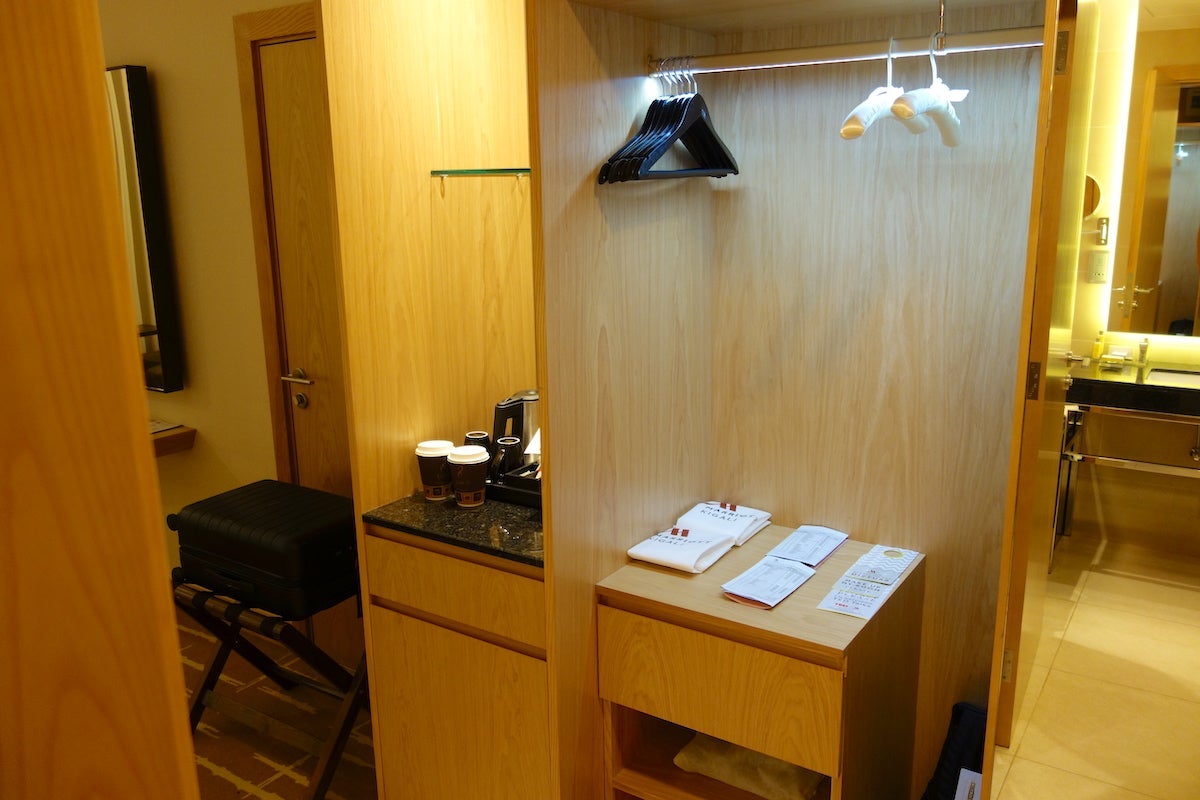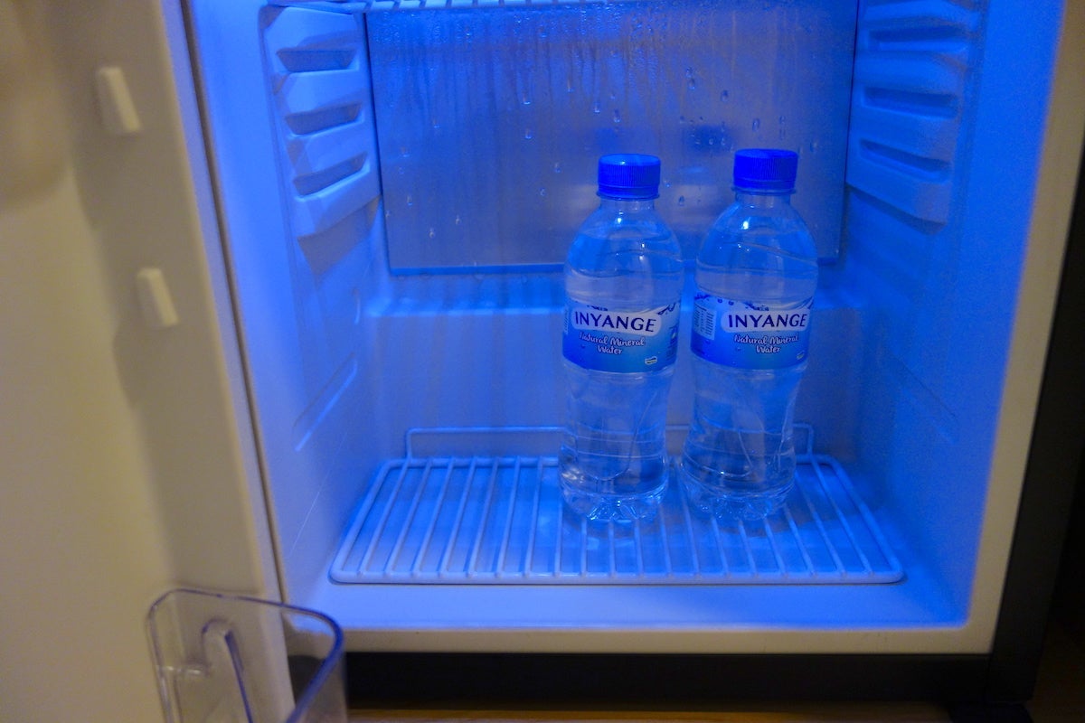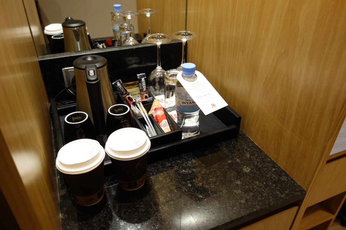The minibar was in the entrance walkway. It included a kettle and complimentary bottled water.