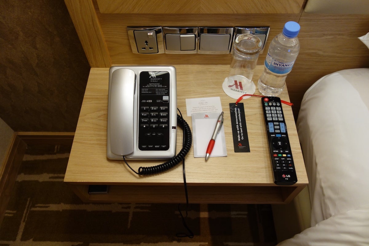 The nightstands to either side had universal power outlets and switches for all the lights, though the outlet on one side was being used for the clock.