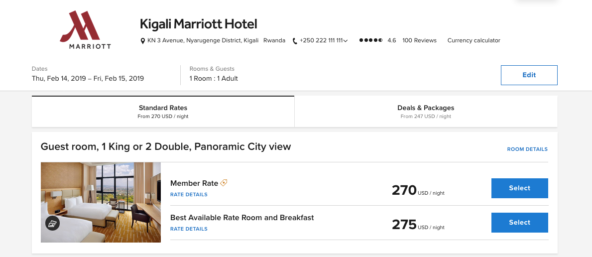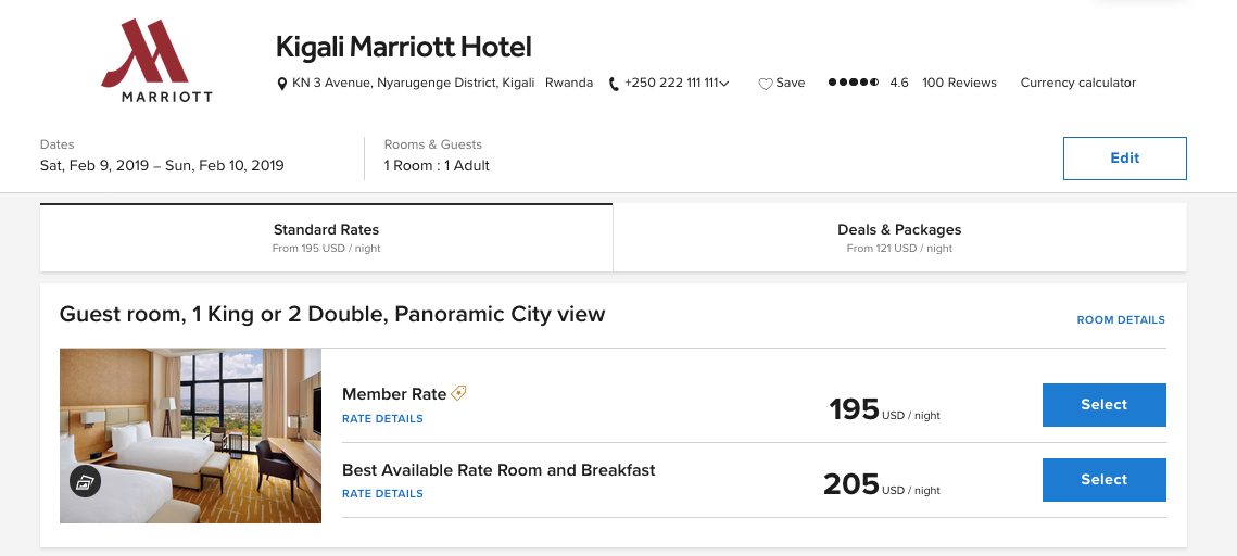 Because I booked two separate nights, I had two different booking experiences. The first was straightforward. There were special rates for East African residents starting at $121 per night. Since I didn't qualify for those, the next best rates were those for Marriott Bonvoy members. Those started at $195 per night, or $205 including breakfast. An extra $10 for breakfast felt like a decent deal, so I went ahead and booked that. The total came to $254 with taxes and fees.