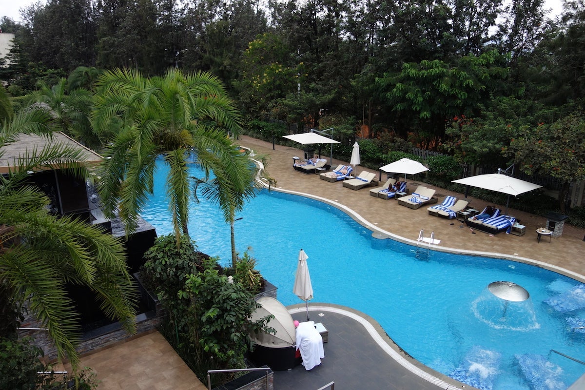 There was a large pool that curved along nearly the same length as the main hotel building. There was also a small children's play area nearby with an inflated bouncy castle.