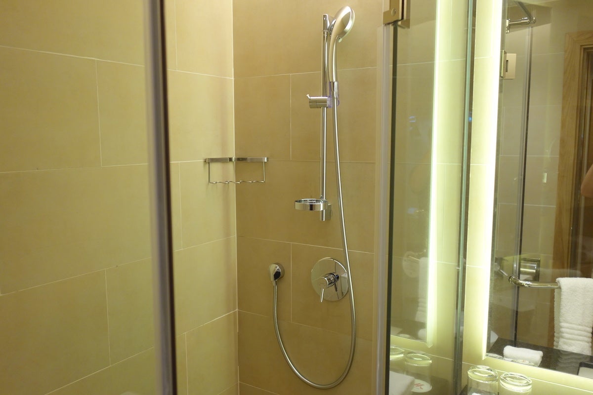 The walk-in shower was glassed-in — no leaks here — and had a single, handheld shower head that you could lock into position on a wall fixture.