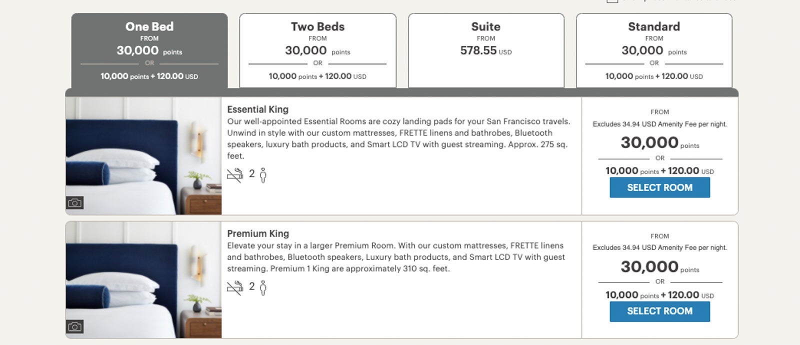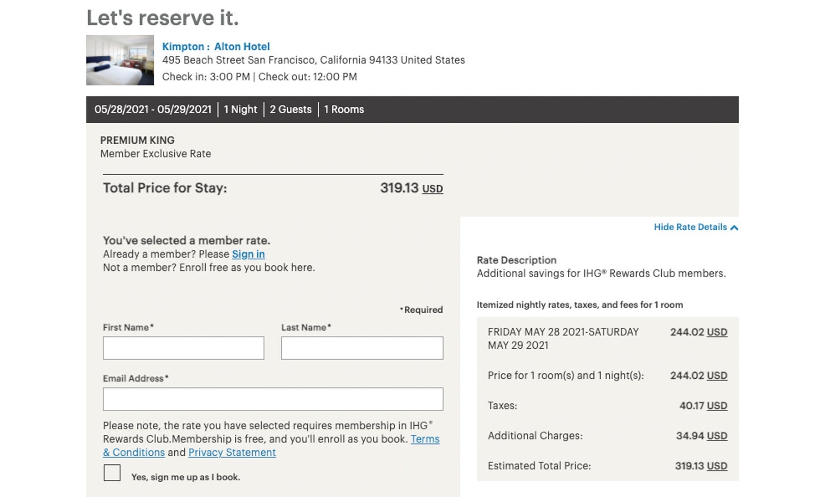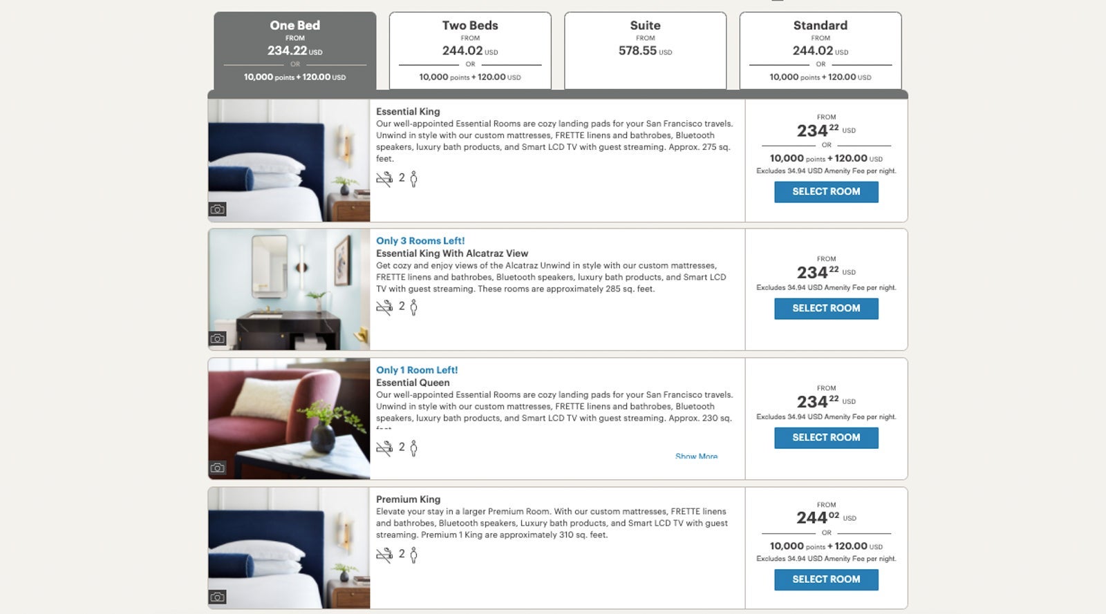 To my surprise, the Kimpton options in the city were more limited than I remembered. The Sir Francis Drake was sold earlier this year and is no longer a Kimpton, and another property, the Kimpton Buchanan, appears to be closed until late July. However, I saw a new option called the Kimpton Alton had appeared on the scene. Paid rates were $234 to $244 per night on my date, but taxes and fees brought that up to $319 to $332 (more on this later).