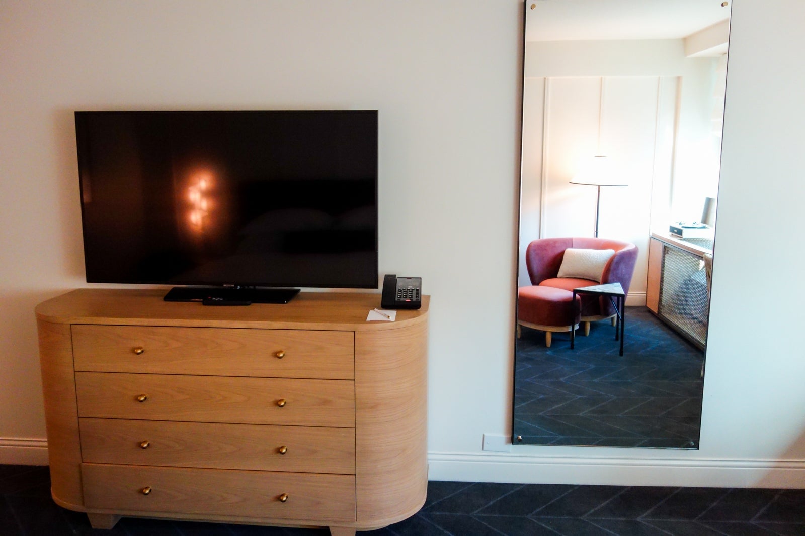 Finally, on the wall across from the bed, a full-length mirror hung next to a chest of drawers made from blond-hued wood with bronze knobs, and an LCD television over which you could stream content from your personal devices.