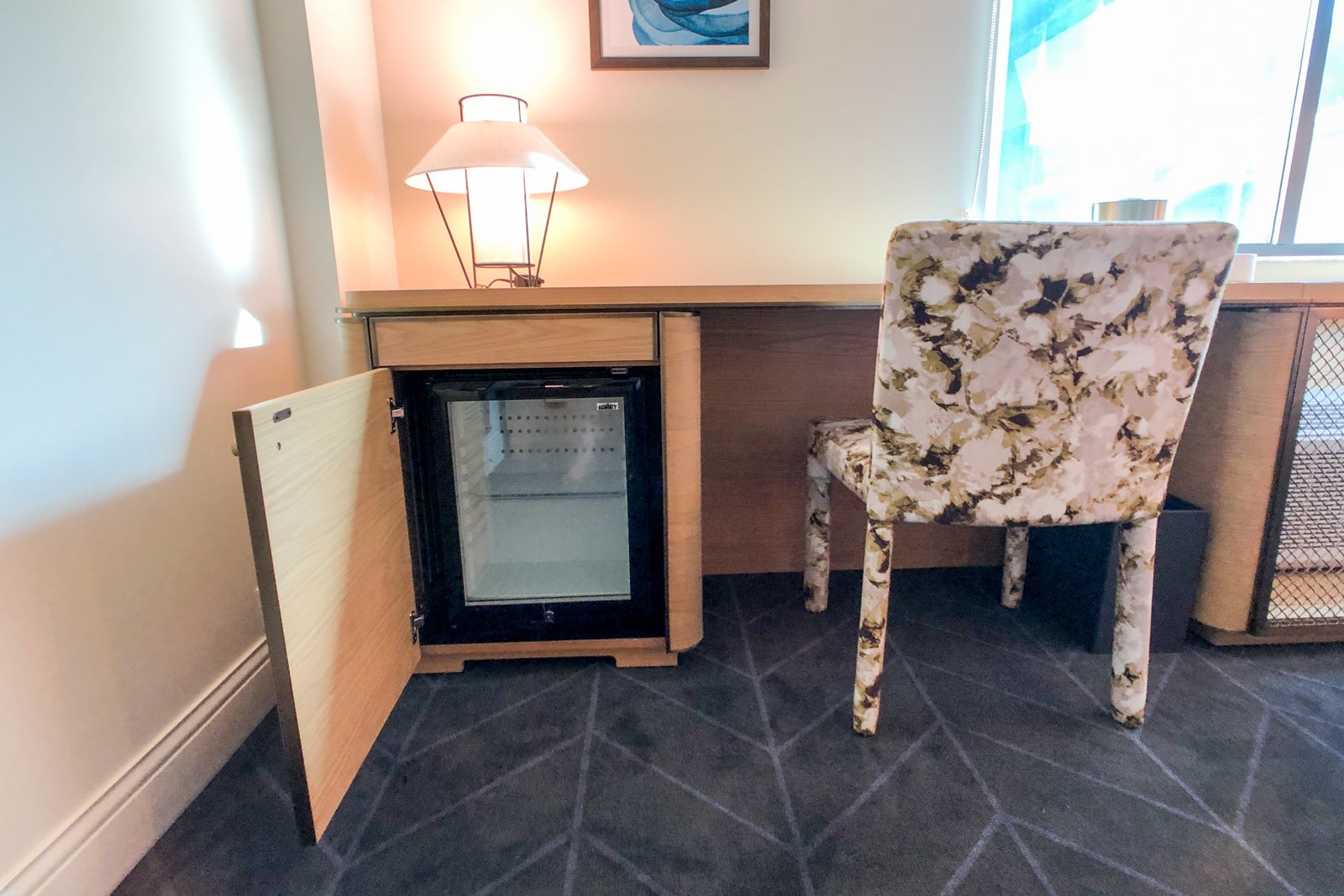 There was a small workspace with a floral-patterned chair, embedded plugs and a reading lamp. Next to that was a cupboard for the minifridge, though it was not stocked for us due to COVID-19 regulations.