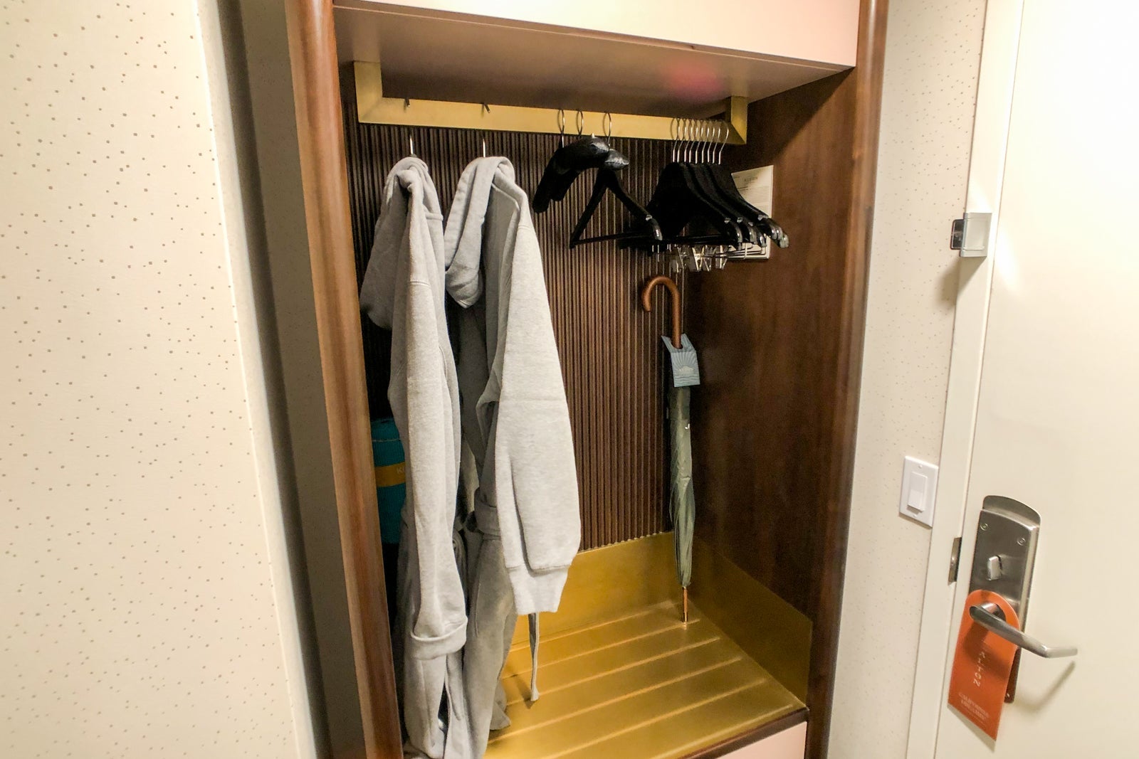 Located near the front door, the closet was on the small side. It held a rack for hanging clothes, a signature Kimpton yoga mat, a large drawer for apparel and another holding the safe, as well as a surface for setting down a suitcase.