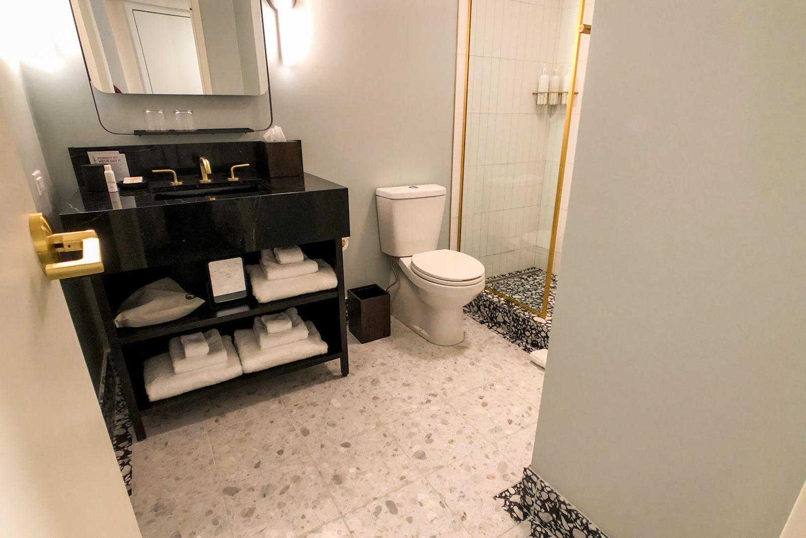 Next to the closet, the bathroom was also on the small side, but it was nicely laid out and featured eye-catching terrazzo floors in black and white marble. It contained a single, black-marble sink with shelves for towels and toiletries.