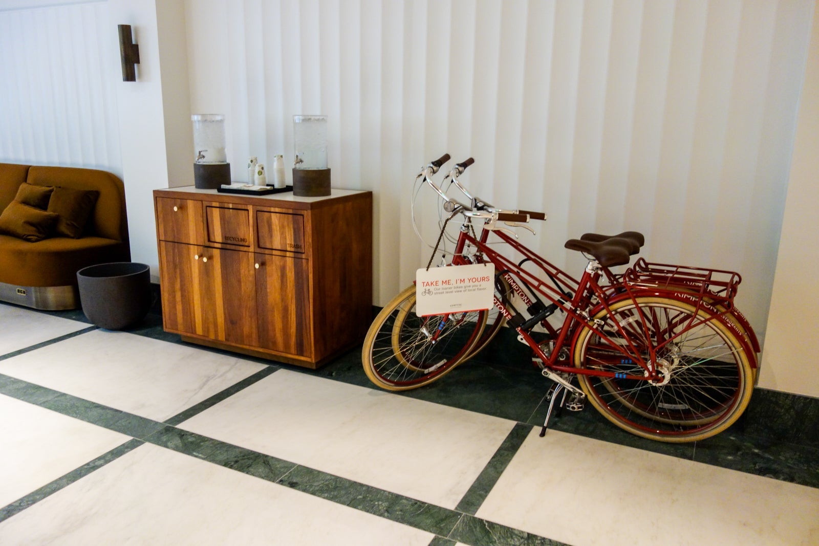 Just beyond the reception desk was a credenza with water dispensers and cups, as well as a couple of bikes you could borrow to explore the neighborhood.