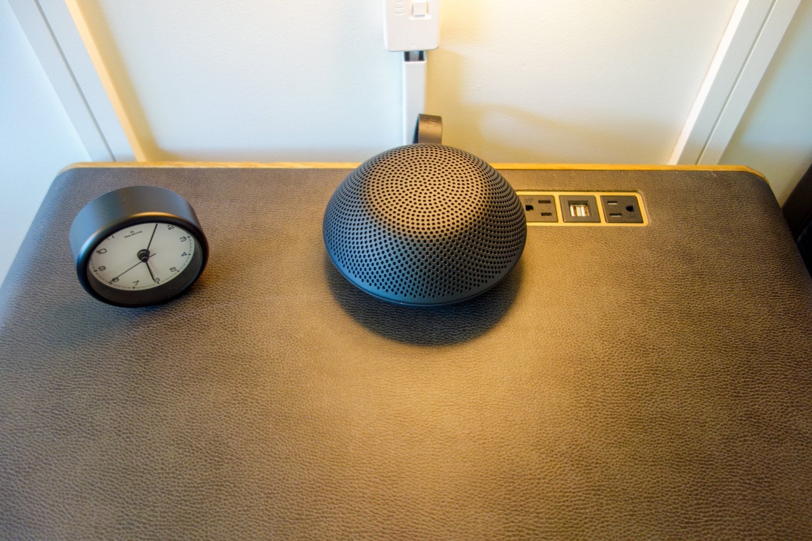It was flanked on each side by a wooden nightstand. Both had embedded USB and power outlets, while one had a clock and Bluetooth speaker. The reading lights were made of perforated metal sculpted into swirls.