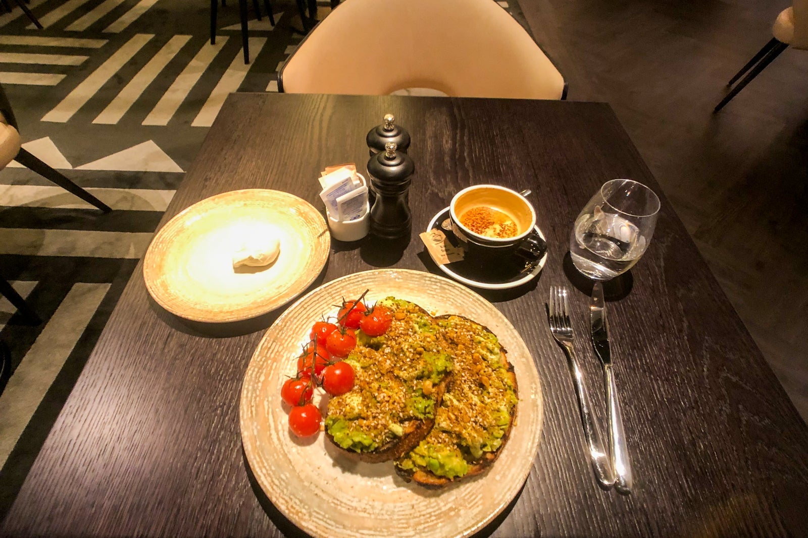 I stopped by Luke's Kitchen for breakfast the morning of my stay and thoroughly enjoyed the smashed avocado with confit tomatoes, savory dukkah powder, a drizzle of green goddess dressing and a poached egg over two massive slices of sourdough, plus an excellent cappuccino. My total came to $22.