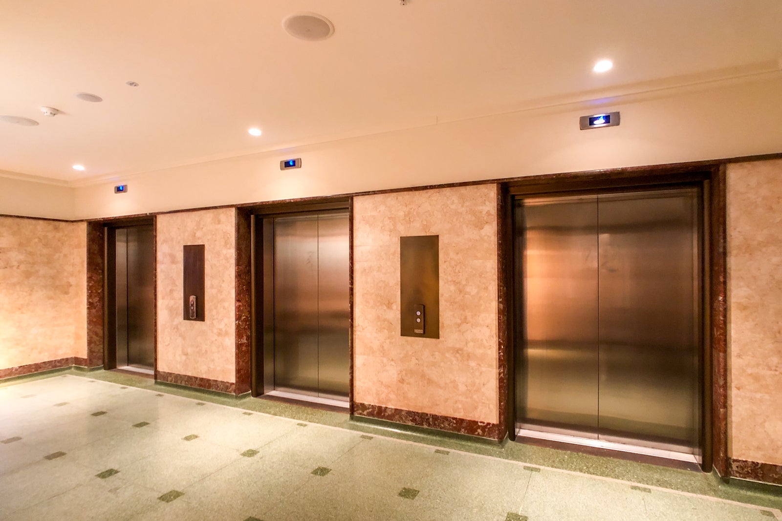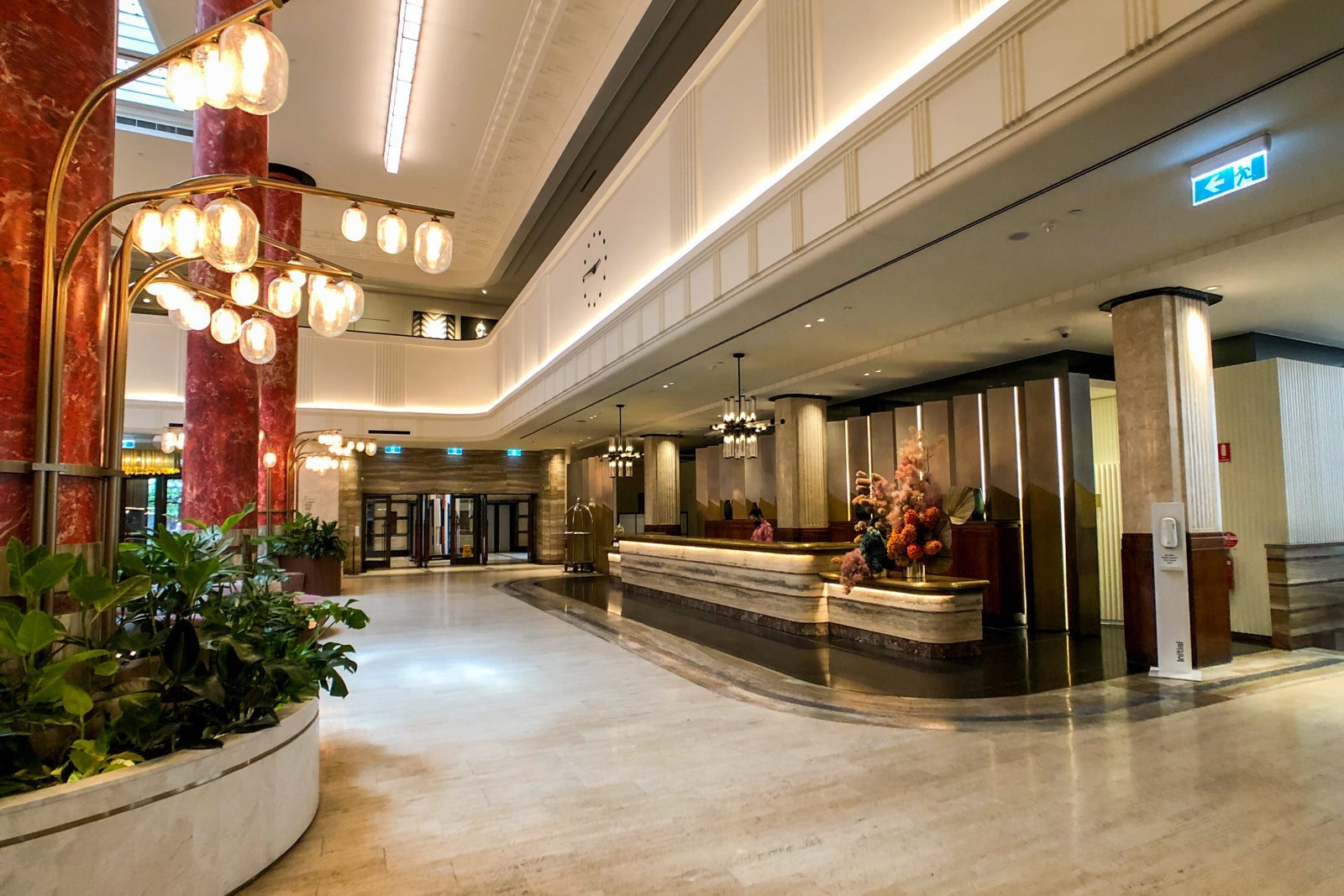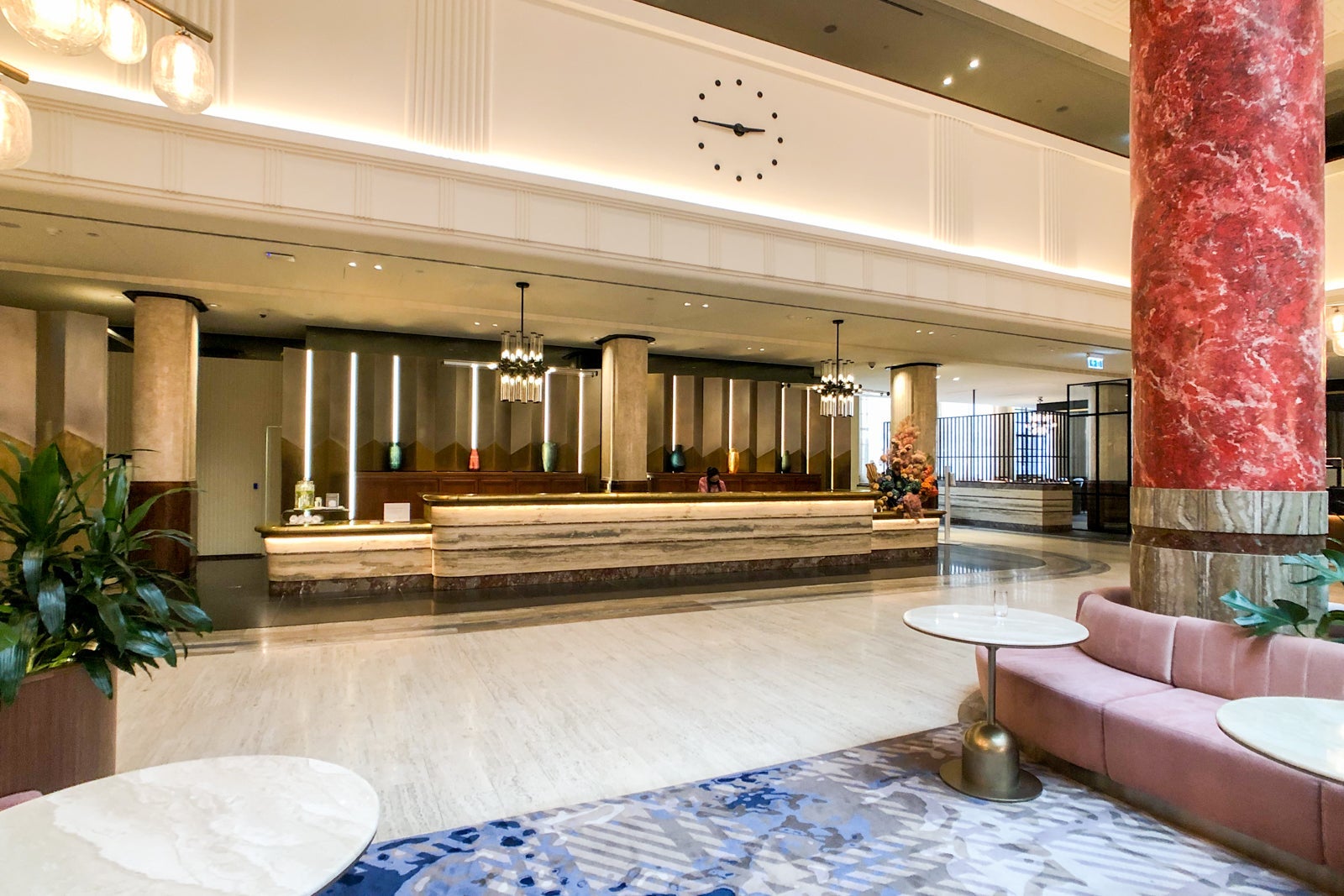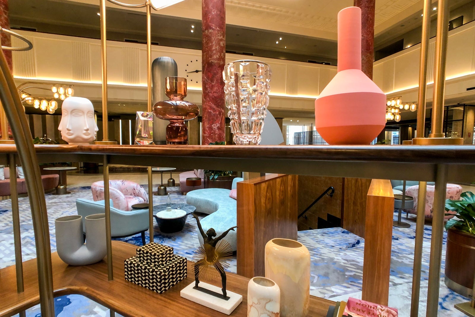 That heritage is evident throughout in features like the minimalist clock embedded in the mezzanine overlooking the lobby, colorful terrazzo floors and ornately molded plaster throughout the public areas.