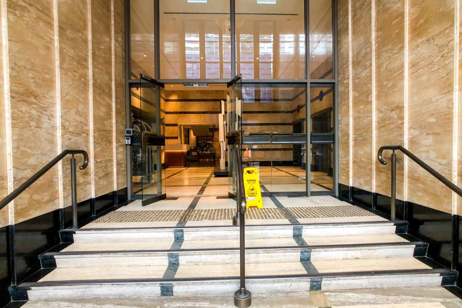I arrived at the hotel at 2 p.m., an hour before the standard check-in time, and entered through the Pitt Street door. There was a small flight of stairs leading to an elevator lobby with an installation by artist Tony Twigg, though the entrance on Bathurst Street had no stairs.
