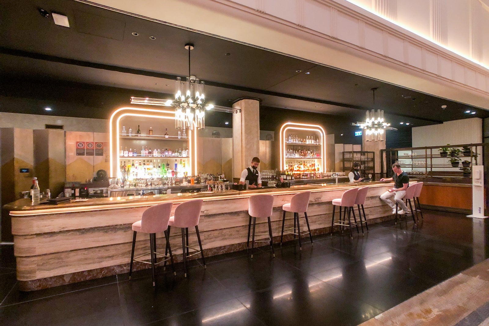 Casually grouped seating areas radiated out from those focal points, featuring banquettes and low-slung armchairs with that roundedness that is a signature of the art deco aesthetic, all upholstered in rich pastel tones and abstractly patterned velvet, clustered around small, marble-topped tables.