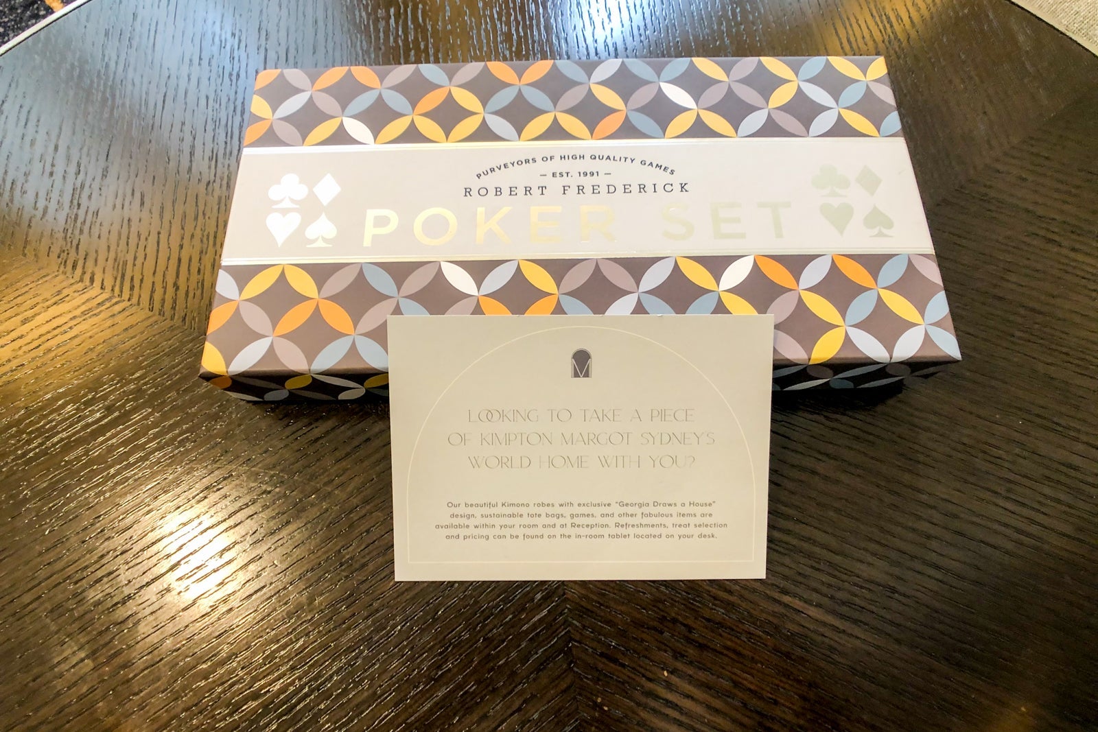 In addition to the king-size bed, the room held a simple, gray loveseat and coffee table with a boxed poker set you could purchase to take home with you.