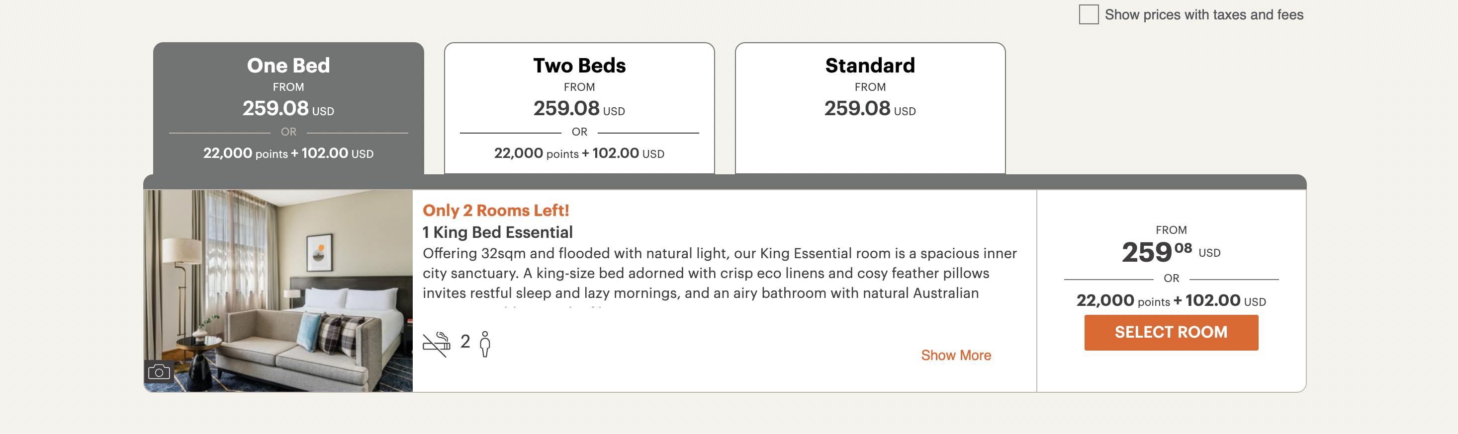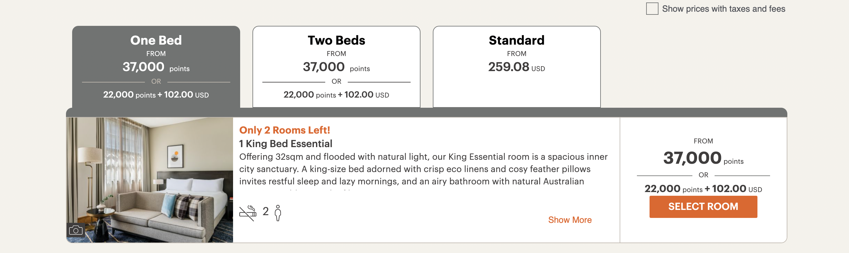 Watching rates the week I was due to arrive, I found nights for a standard (Essential) room with one king bed available from as low as $220 per night and as high as $385 per night. Points rates ranged from 33,000 to 42,500 IHG points per night.