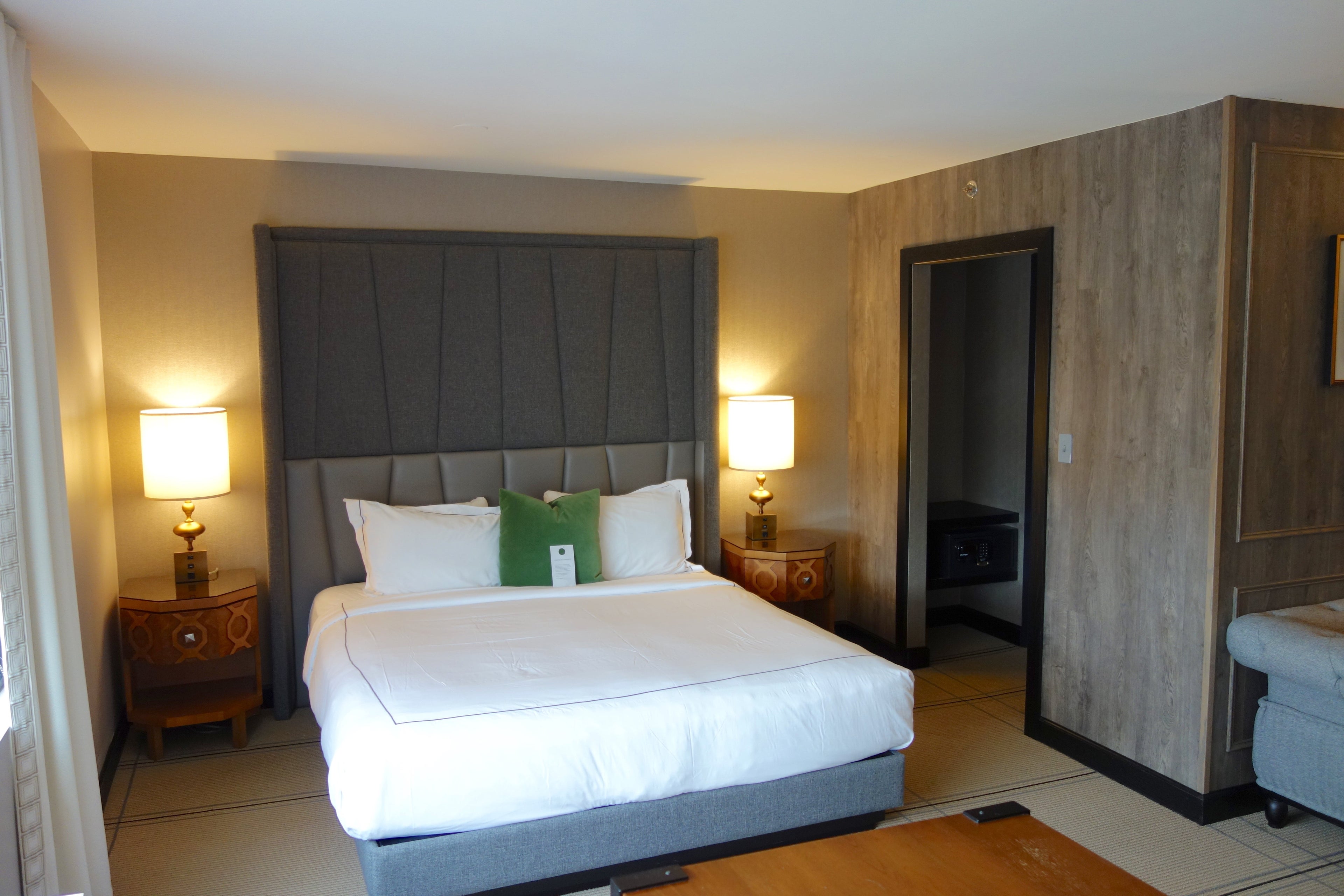 The bedroom portion of the room was dominated by the king bed, which was dressed in white Frette linens with gray piping, and had a two-tone silver headboard.