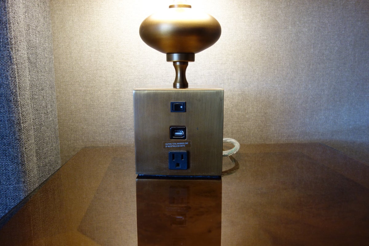 The large desk was in front of the window and the air-conditioning unit. A gold lamp had both a power outlet and a USB port, though there were also outlets embedded into one of the desk's legs.