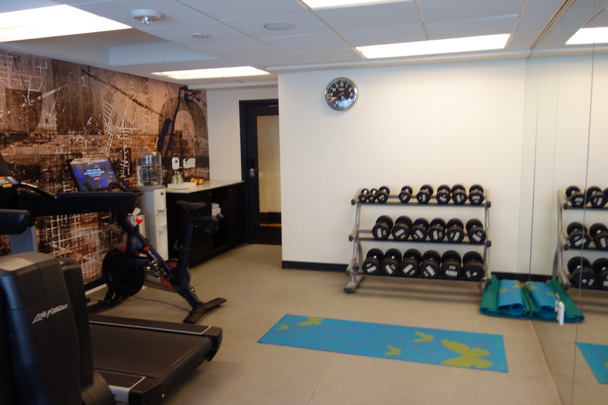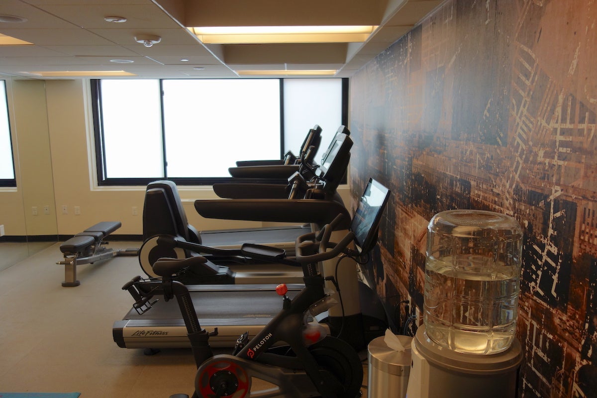 There are several meeting rooms down on the ground floor, but I only got glimpses of them on my way to the gym, which was tiny and contained a few cardio machines, a single Peloton bike and some free weights. If fitness is important to you when you travel, you might want to look into other nearby options.