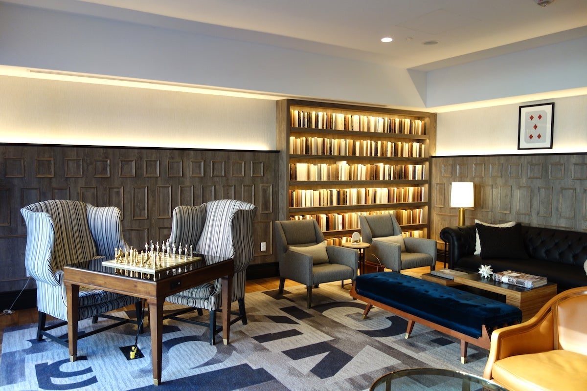 To the left was a living room with a few seating areas, including chairs around a table with an Italian brass chess set, and sofas by the bookshelves lining one wall.