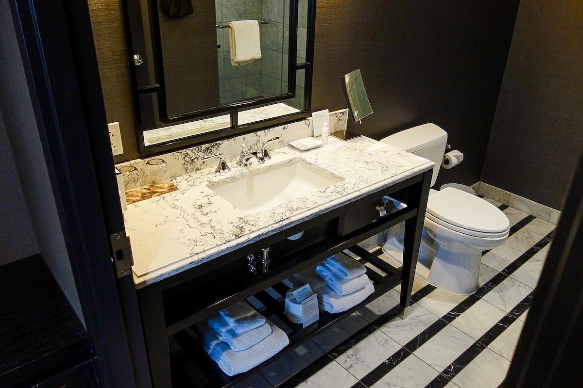 It had a sophisticated look thanks to the black-and-white marble tiling on the floors and walls. As is standard at Kimpton properties at the moment, the bath amenities were Atelier Bloem, with scents like white fig, olive, heliotrope, tuberose, lemon and Kadota fig.